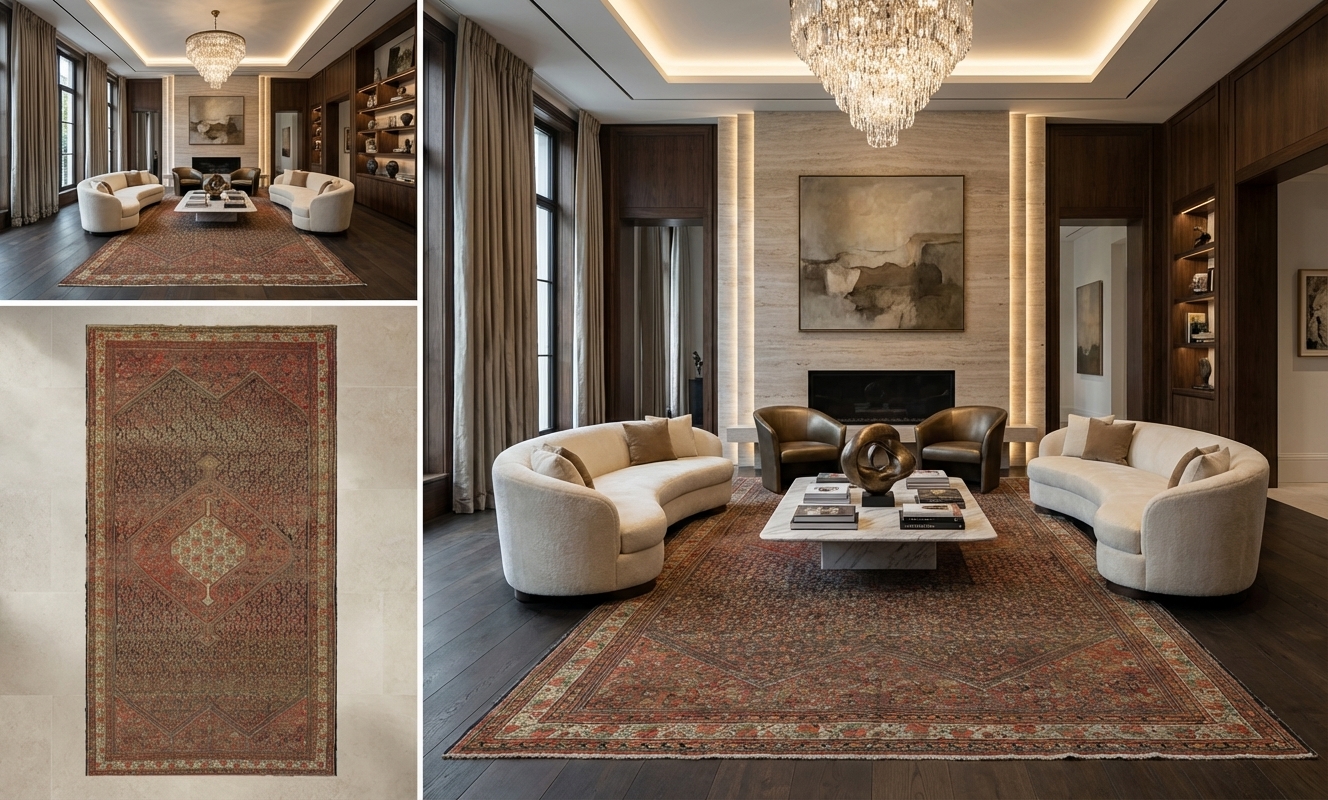 Motifs include a prominent central diamond medallion, small boteh figures, lattice blossom fields, tiny repeating rosettes, and floral border bands framed by angular lines. The dark, earthy palette and dense, geometric visuals suit formal living and dining rooms, libraries, reception spaces, and grand hallways, especially where a traditional, richly patterned foundation is desired.