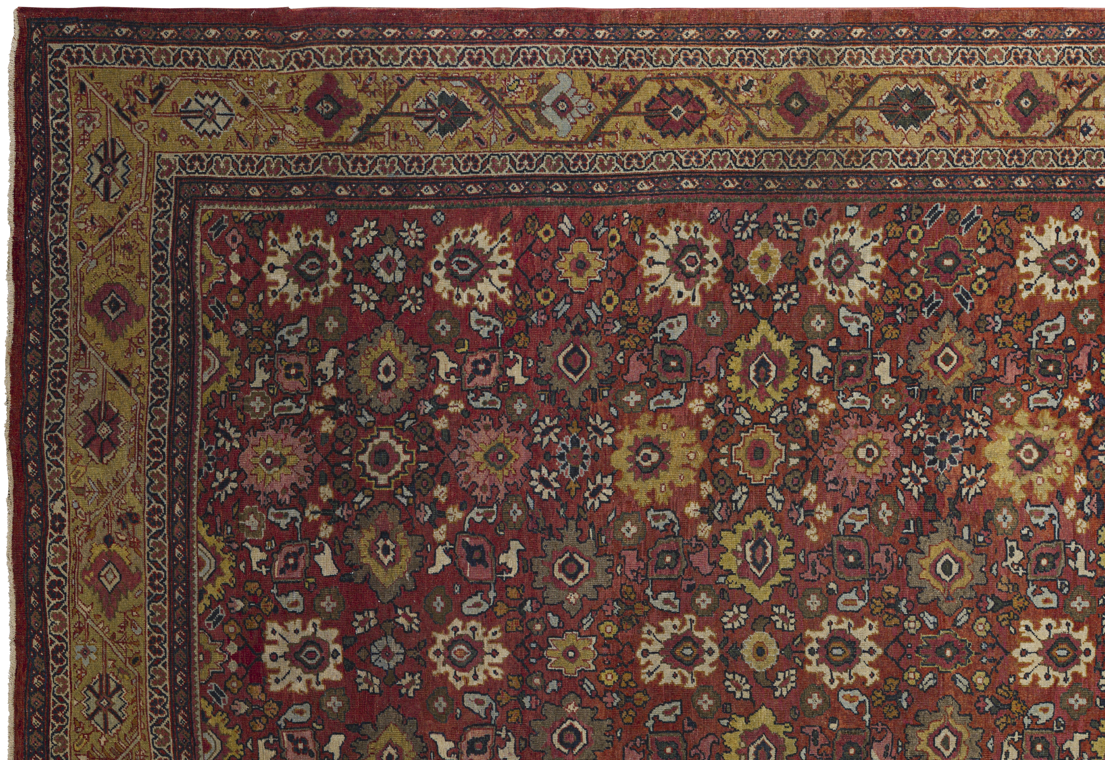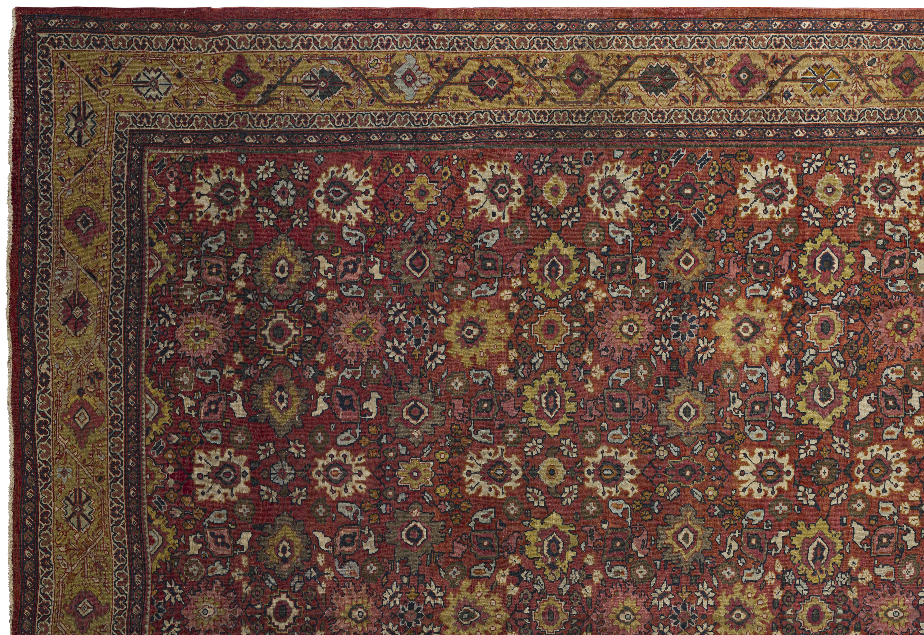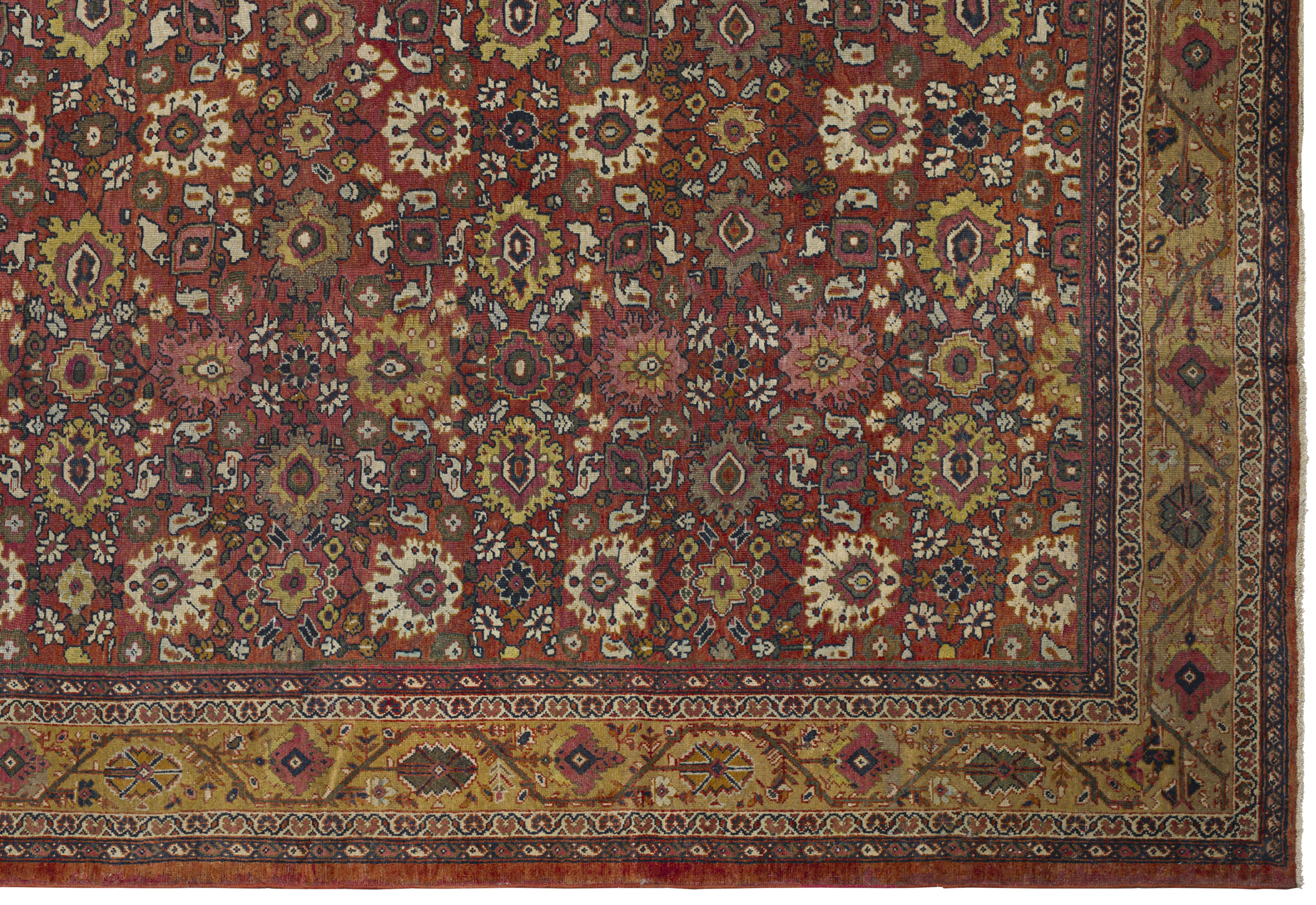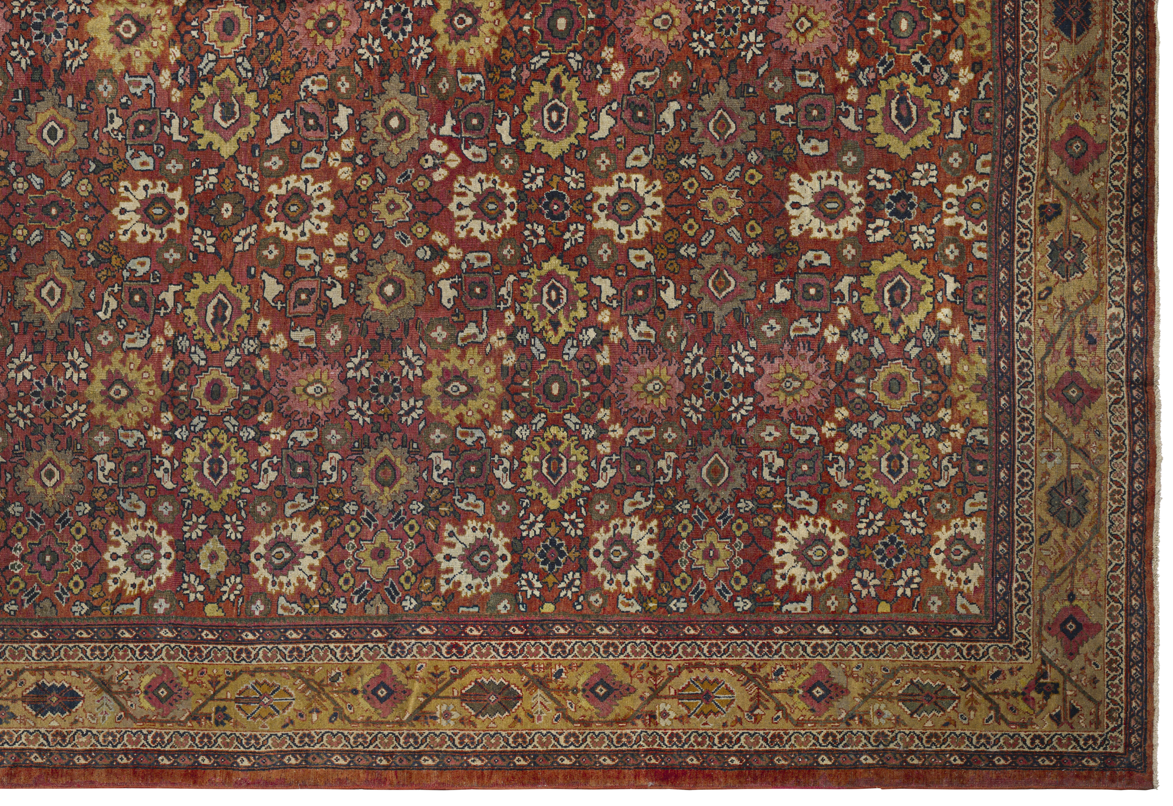 Warm and stately with medium brightness, this antique Sultanabad palace rug pairs a burnt ochre and golden honey palette with dense, geometric allover floral patterning and a premium, formal feel.