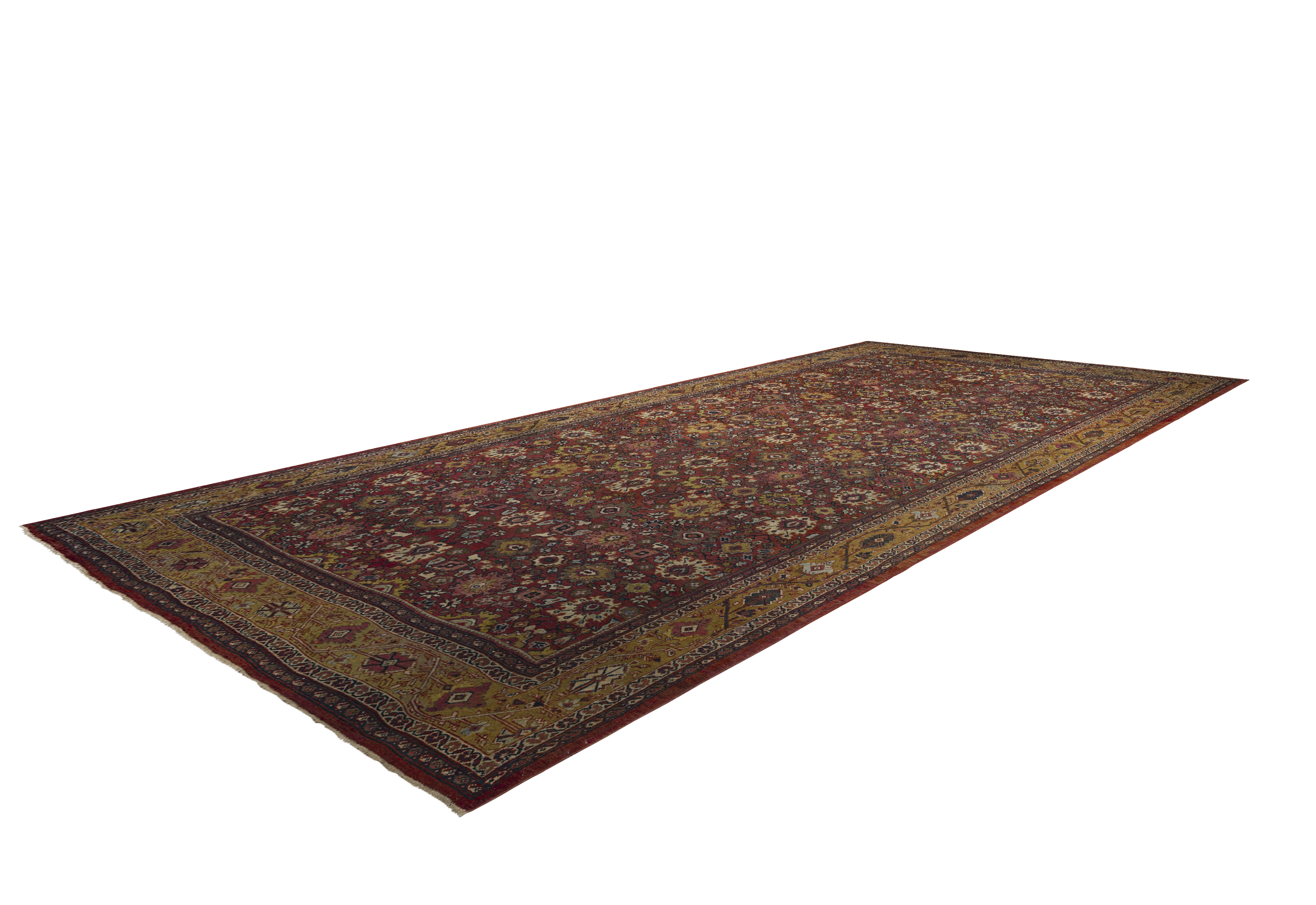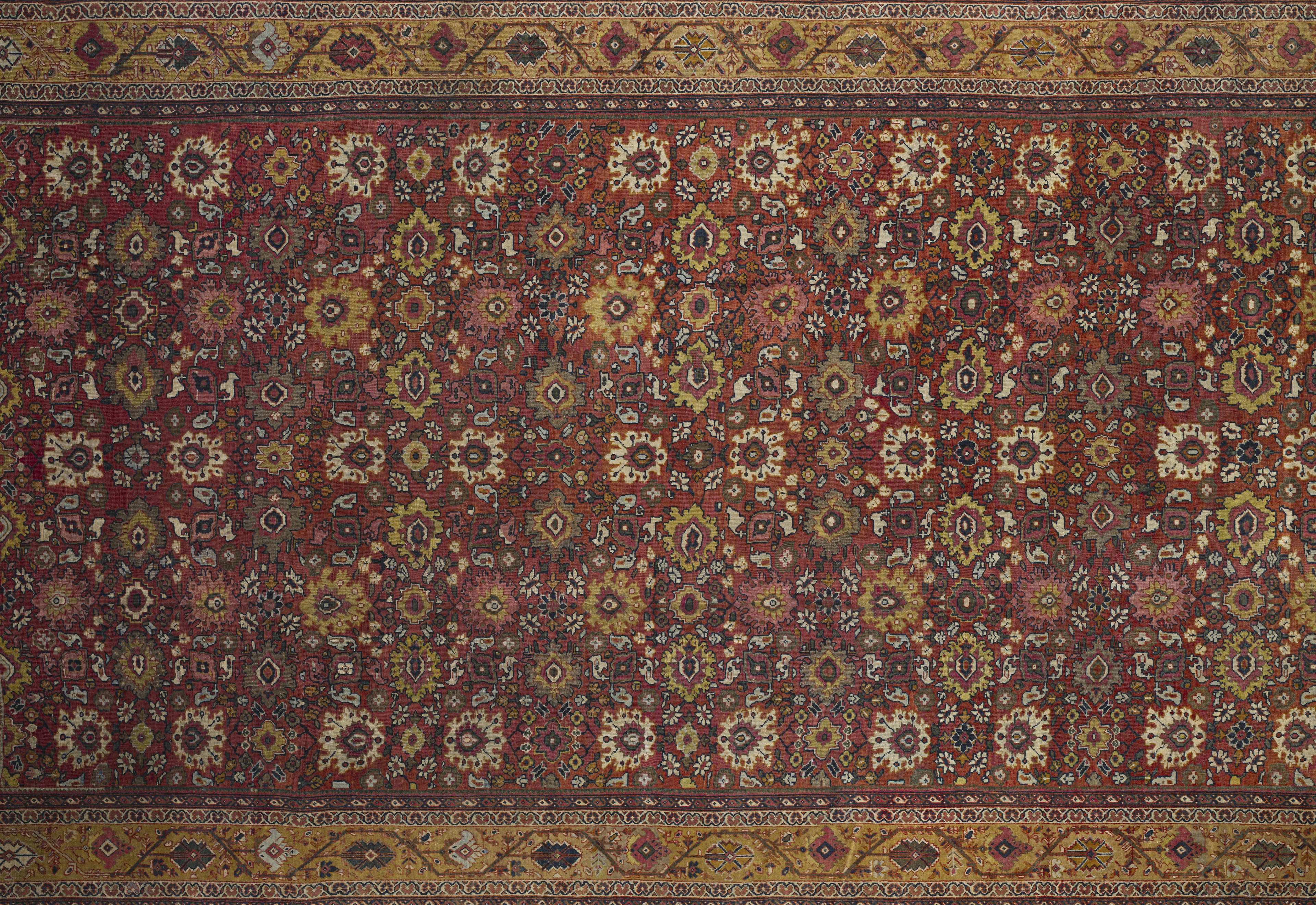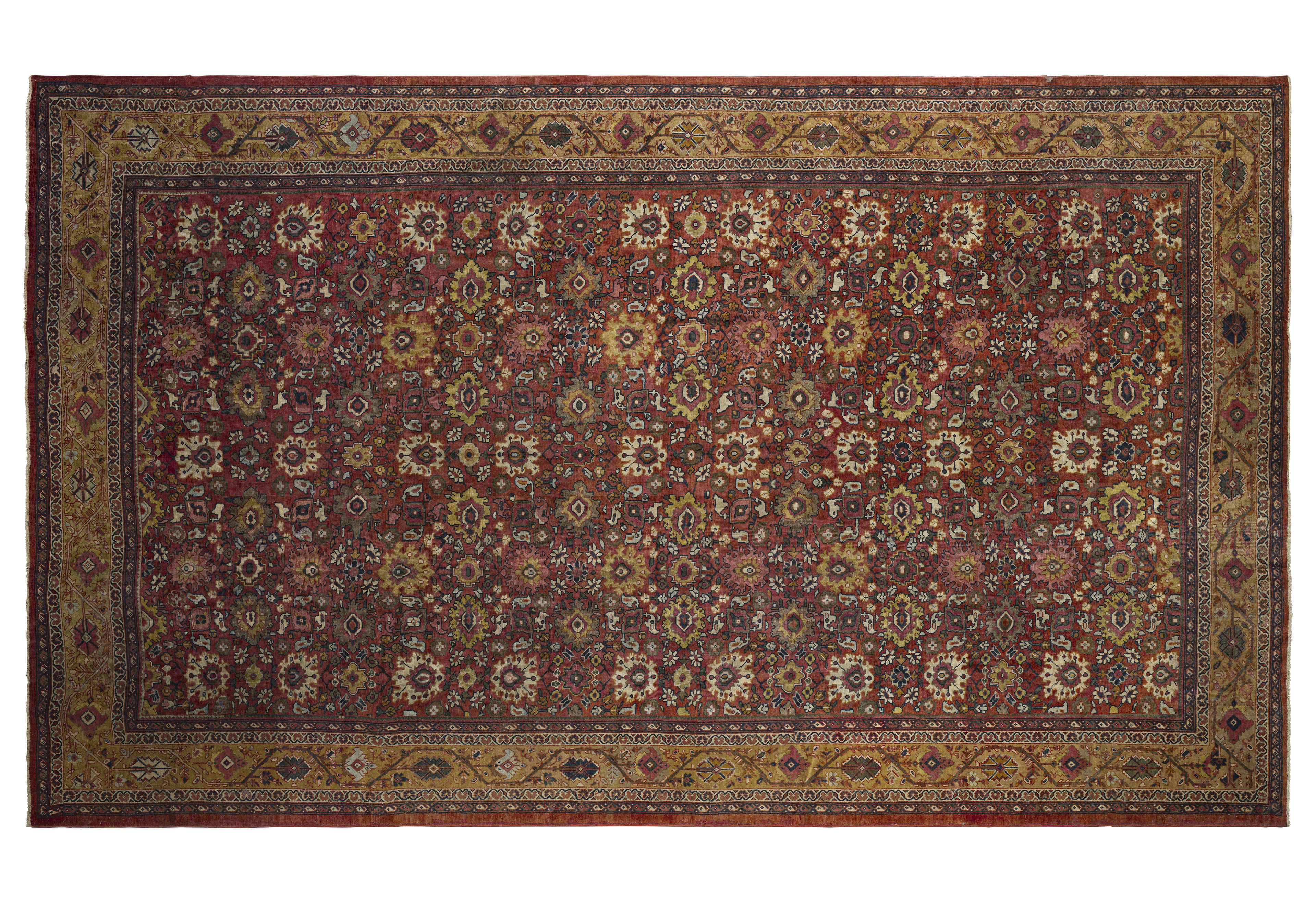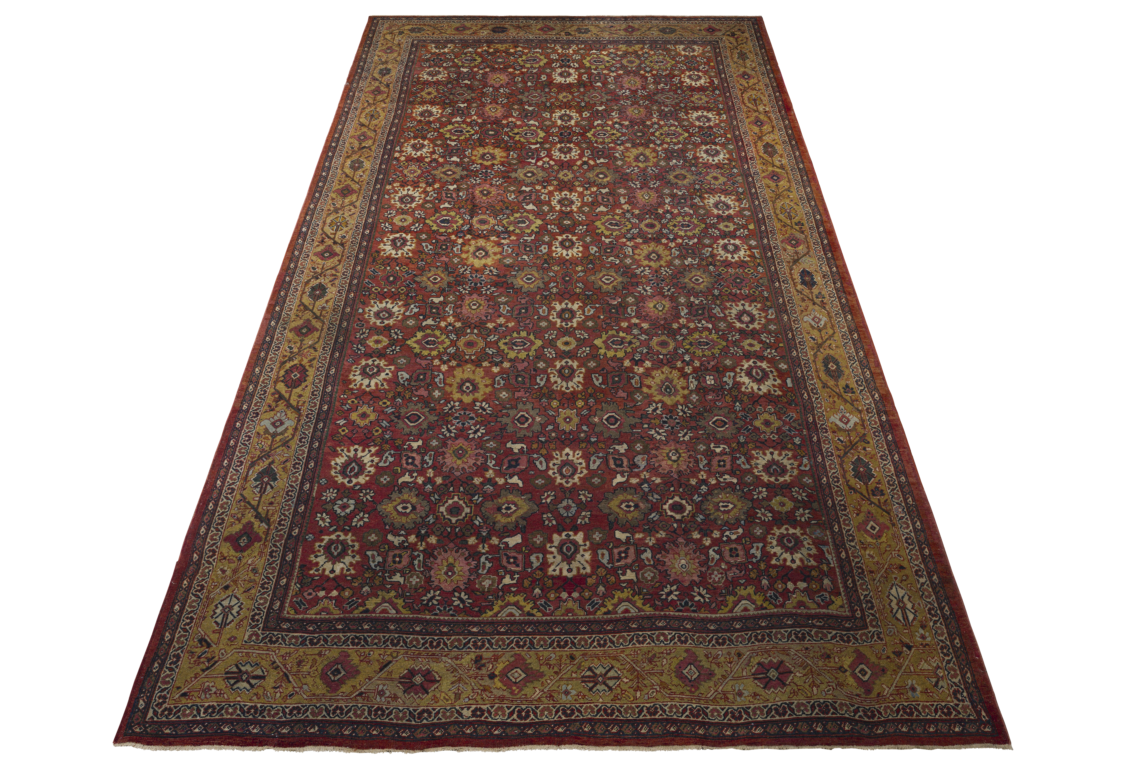 Warm and stately with medium brightness, this antique Sultanabad palace rug pairs a burnt ochre and golden honey palette with dense, geometric allover floral patterning and a premium, formal feel.