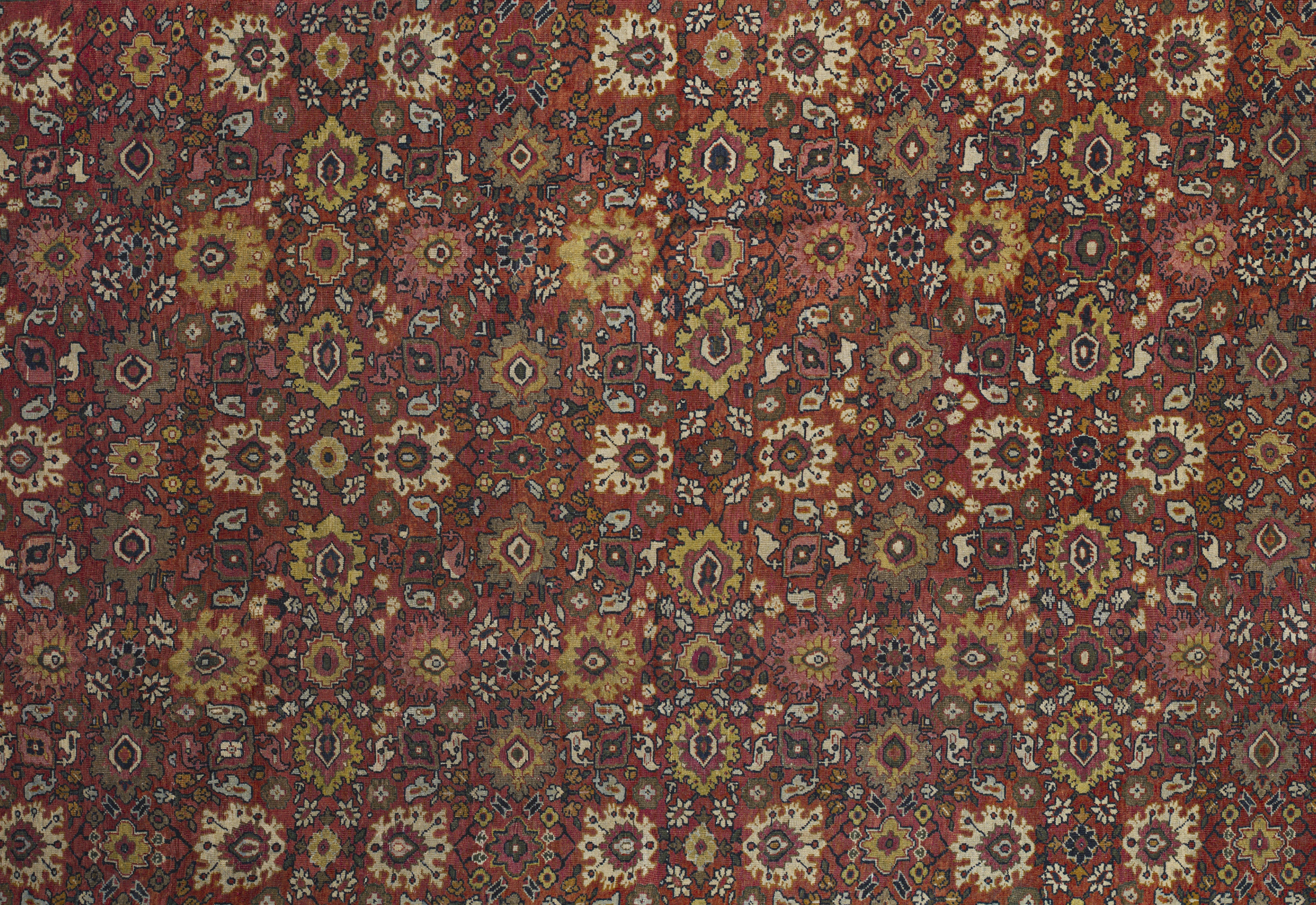 Motifs include repeating rosette clusters, stylized palmettes, serrated leaves, geometric vine scrolls, small flower heads, and layered border work. The warm, earthy palette and dense patterning make it ideal for formal living rooms, dining rooms, great rooms, libraries, gallery halls, and hotel lobbies, especially where a traditional Persian Sultanabad character is desired.