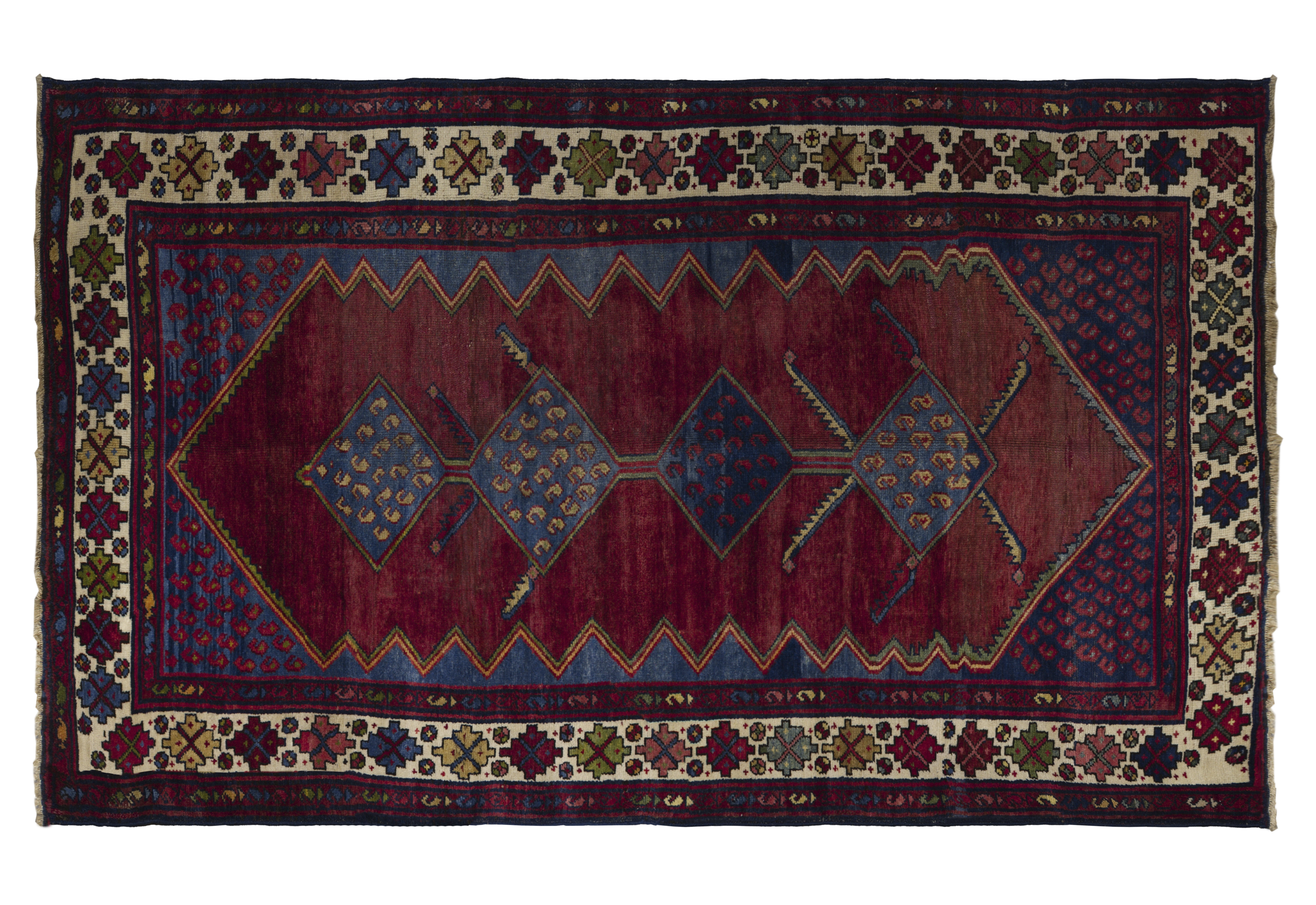 Antique small rug from Persian Hamadan (c. 1870–1890) in brick red with nautical blue and ivory accents, woven in wool with a medium pile. The layout centers on stacked diamond medallions with hooked spandrels, boteh-dotted fields, star rosettes, and stepped zigzag edges framed by multi borders with floral cross motifs. Tribal, geometric character with high durability, easy repair profile, and a standard medium size of 4 ft 7 in x 8 ft 1 in.