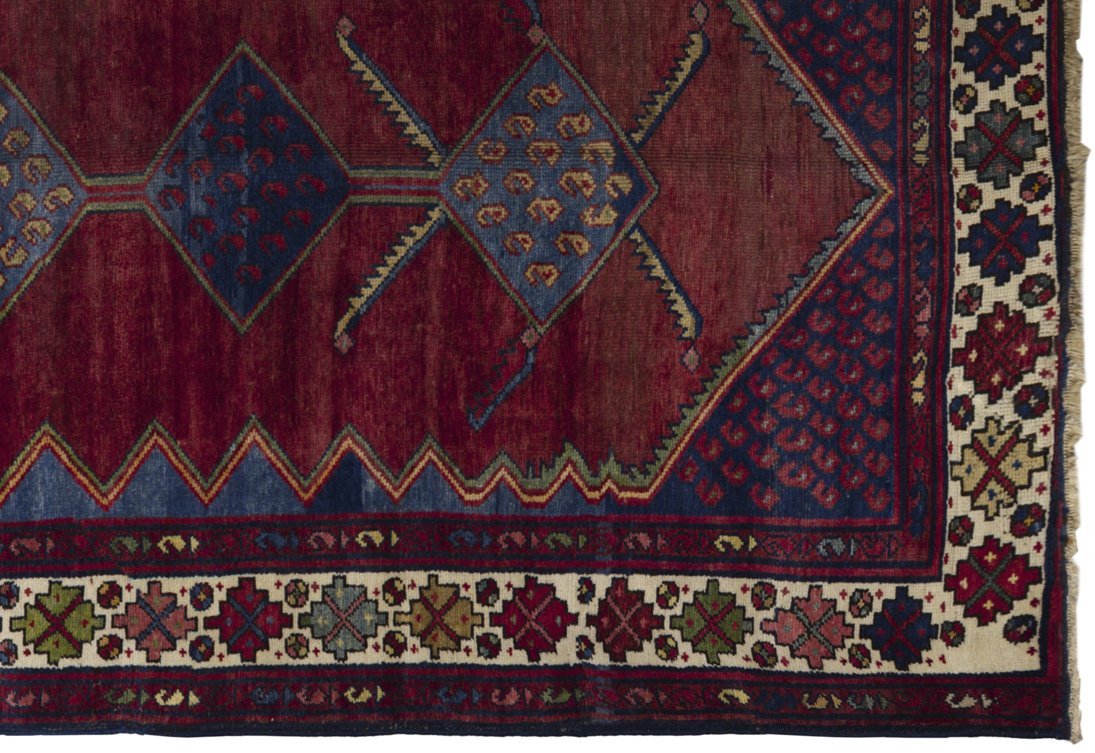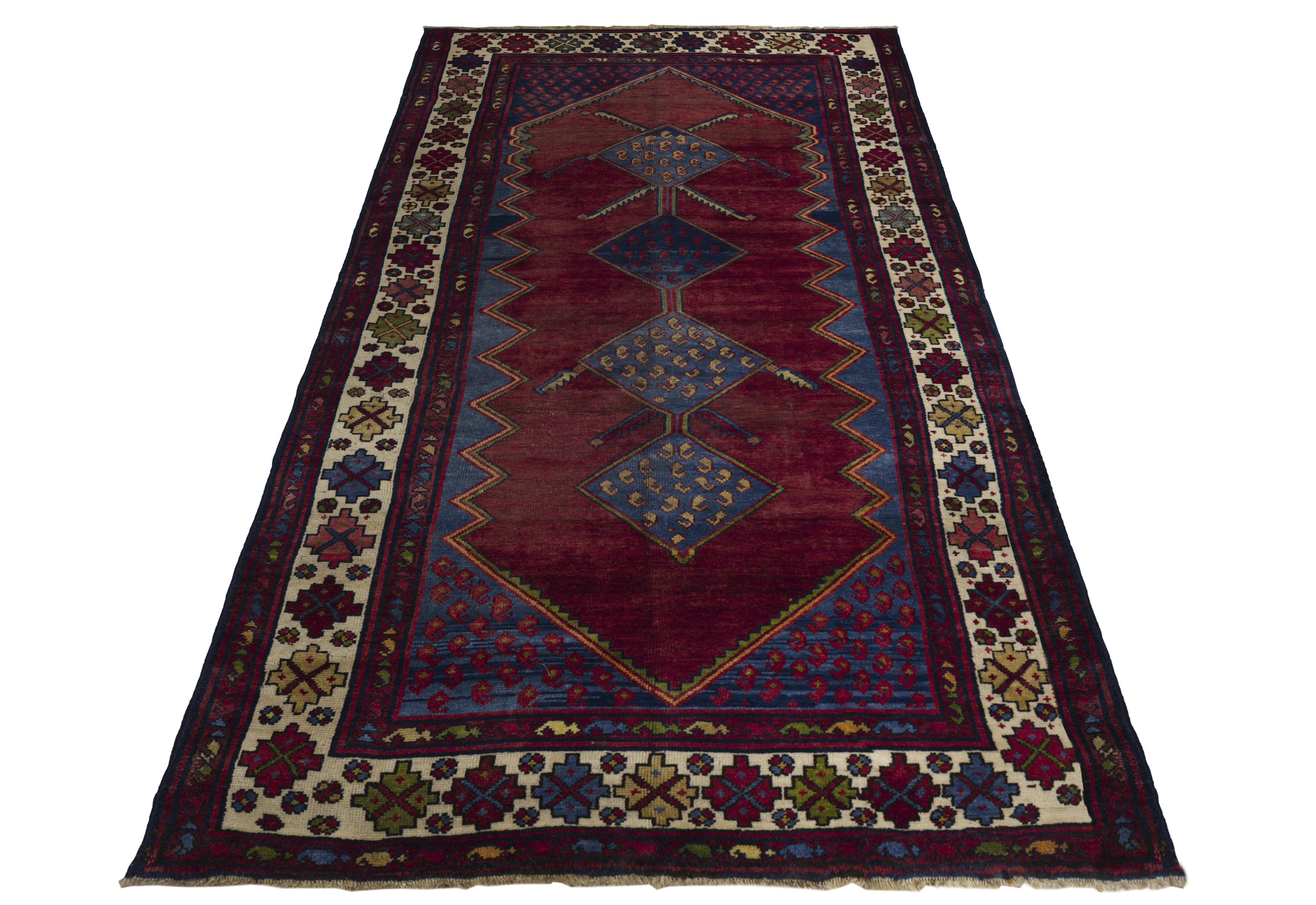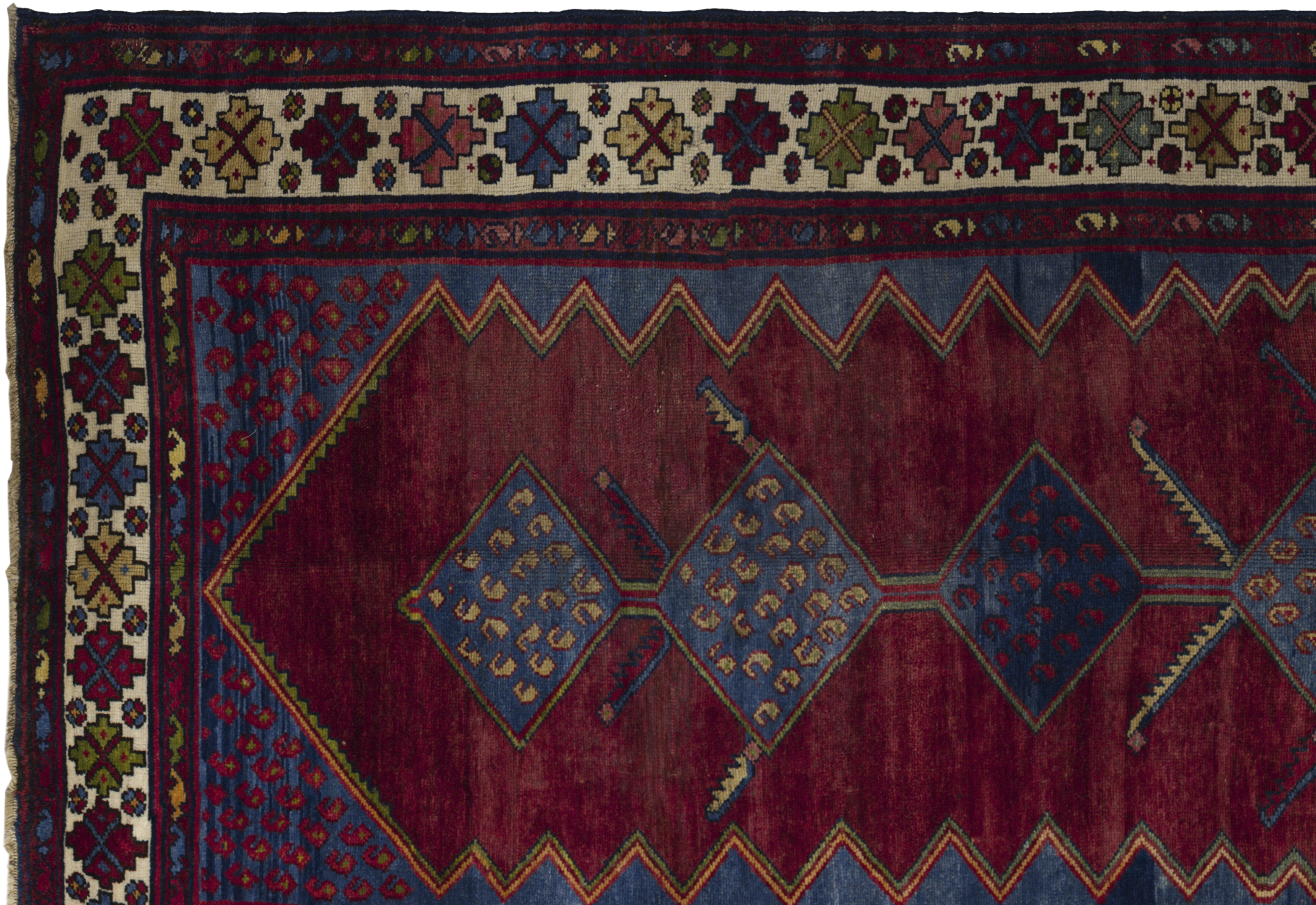 Antique Persian Hamadan tribal rug in brick red with nautical blue and ivory accents, featuring stacked diamond medallions, boteh dots, and star rosettes. Wool, medium pile, highly durable and easy to repair, ideal for living rooms, studies, libraries, hallways, and bedrooms seeking earthy warmth and geometric character.