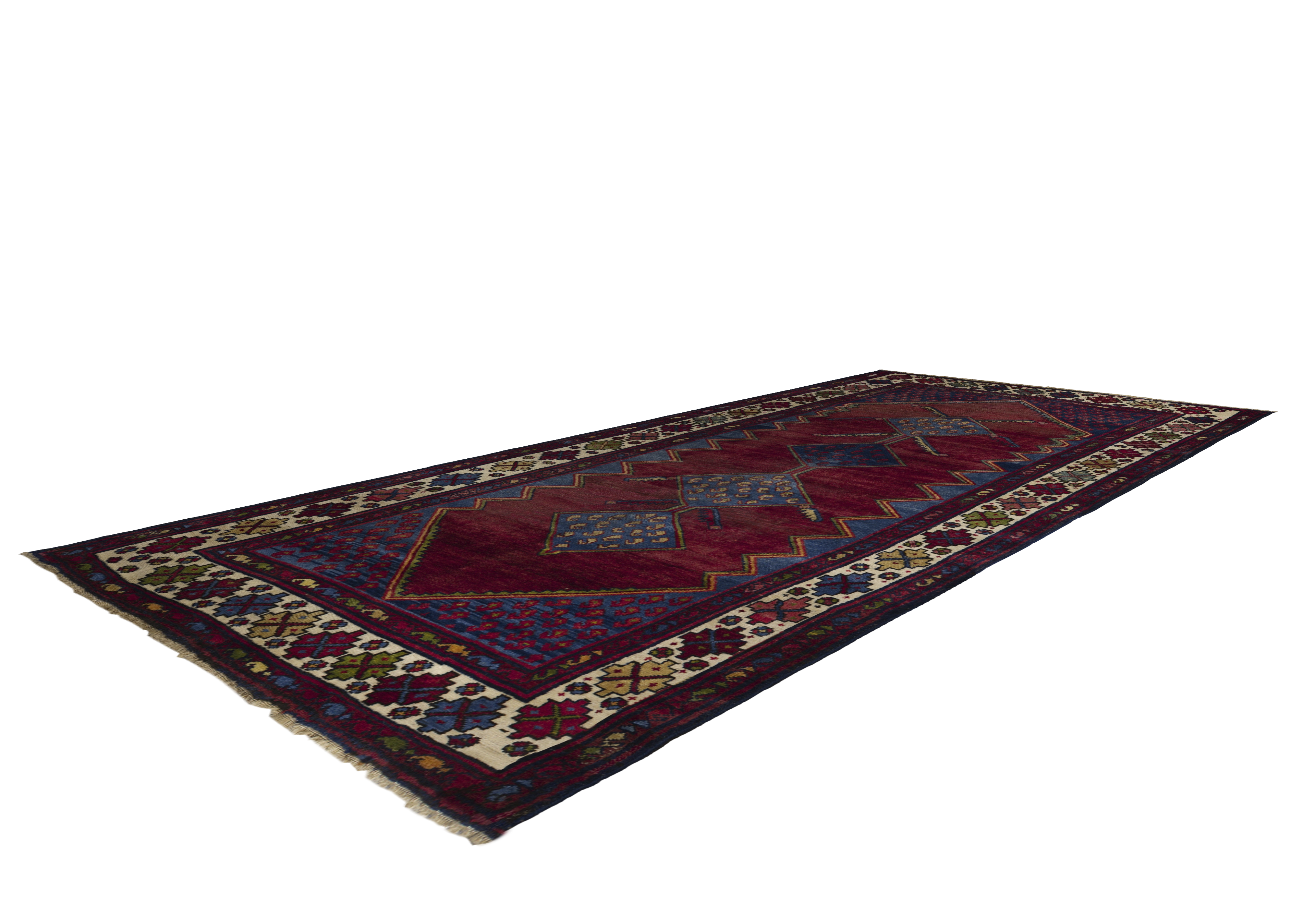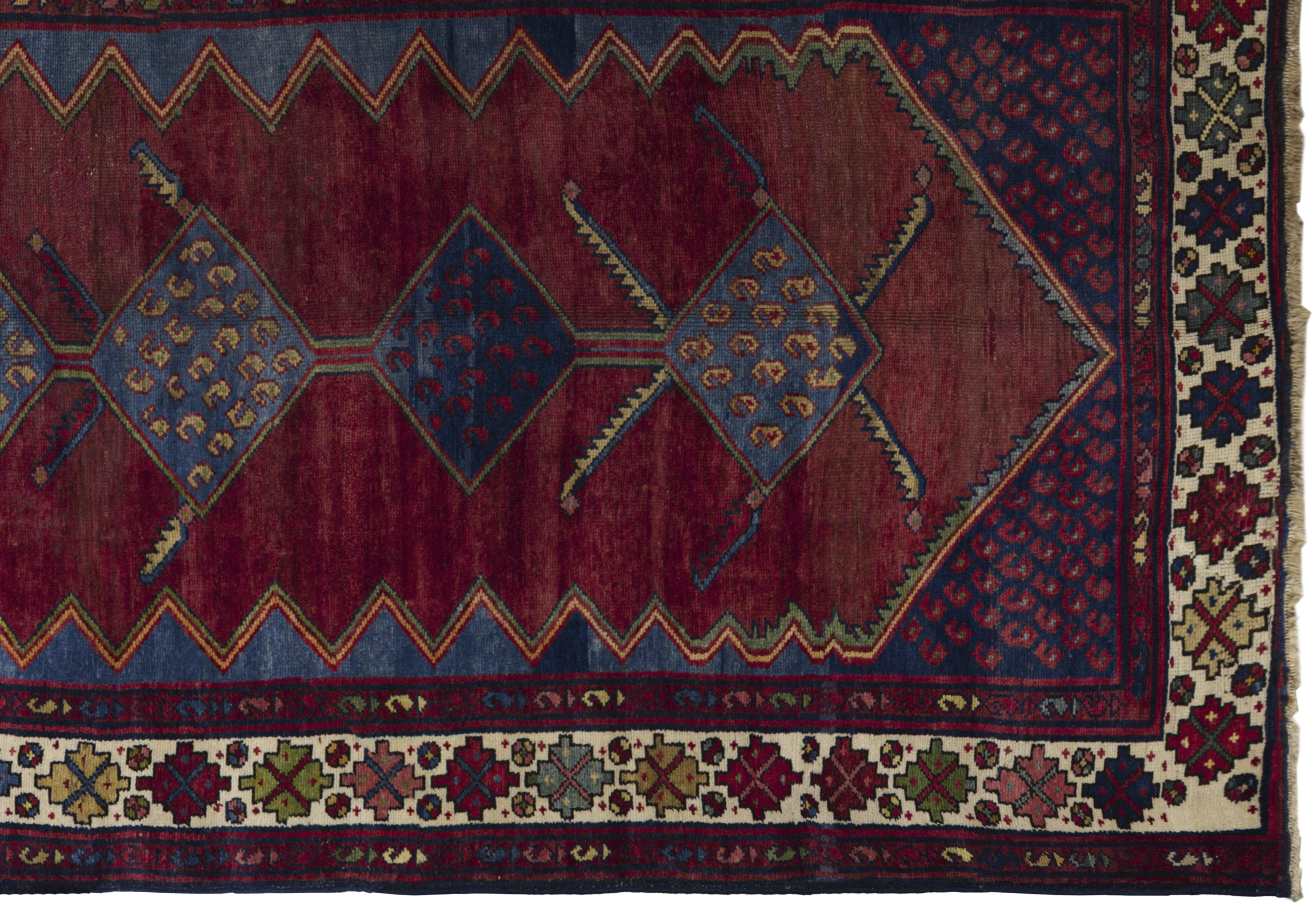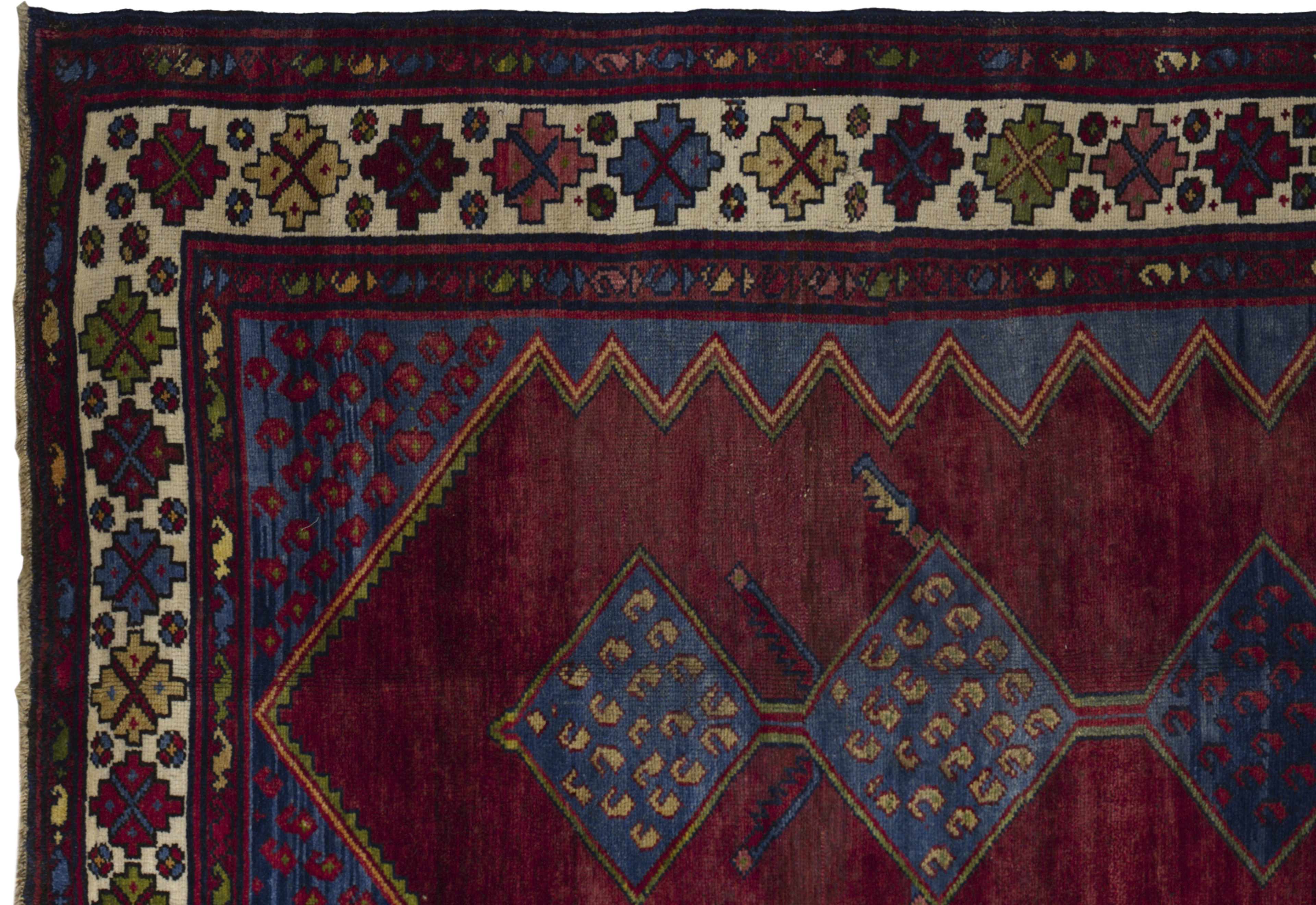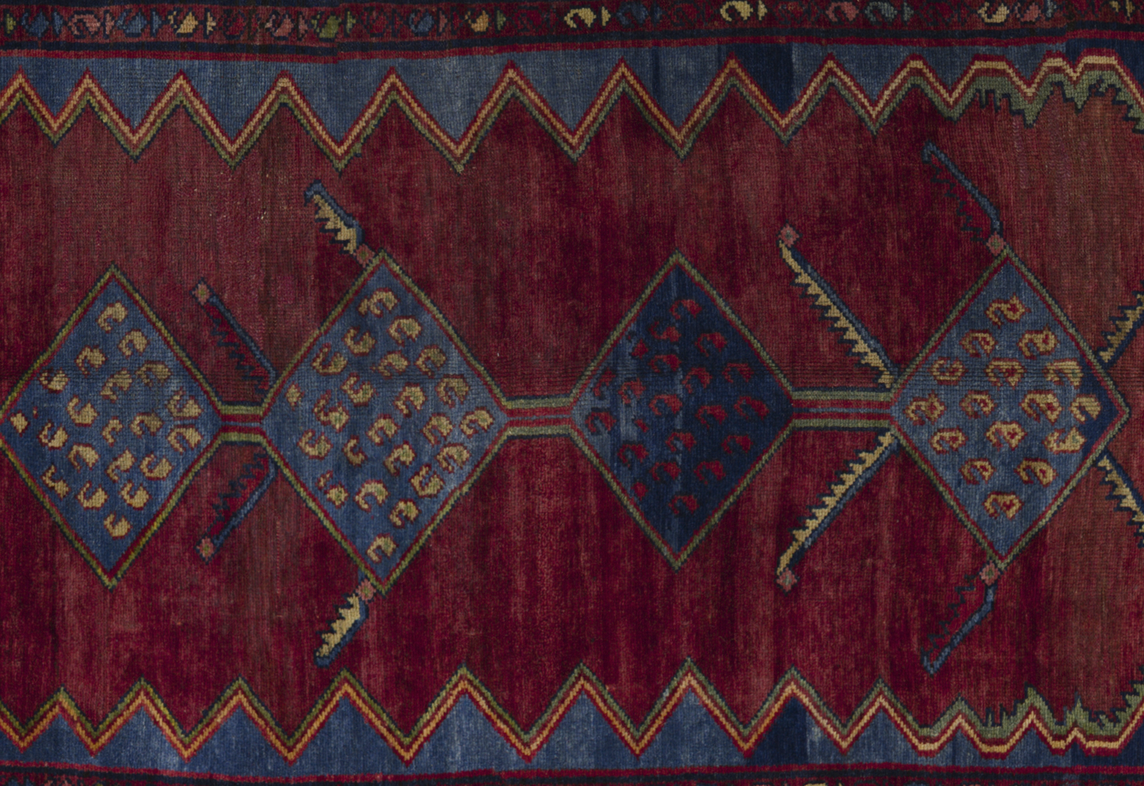 Antique Persian Hamadan tribal rug in brick red with nautical blue and ivory accents, featuring stacked diamond medallions, boteh dots, and star rosettes. Wool, medium pile, highly durable and easy to repair, ideal for living rooms, studies, libraries, hallways, and bedrooms seeking earthy warmth and geometric character.