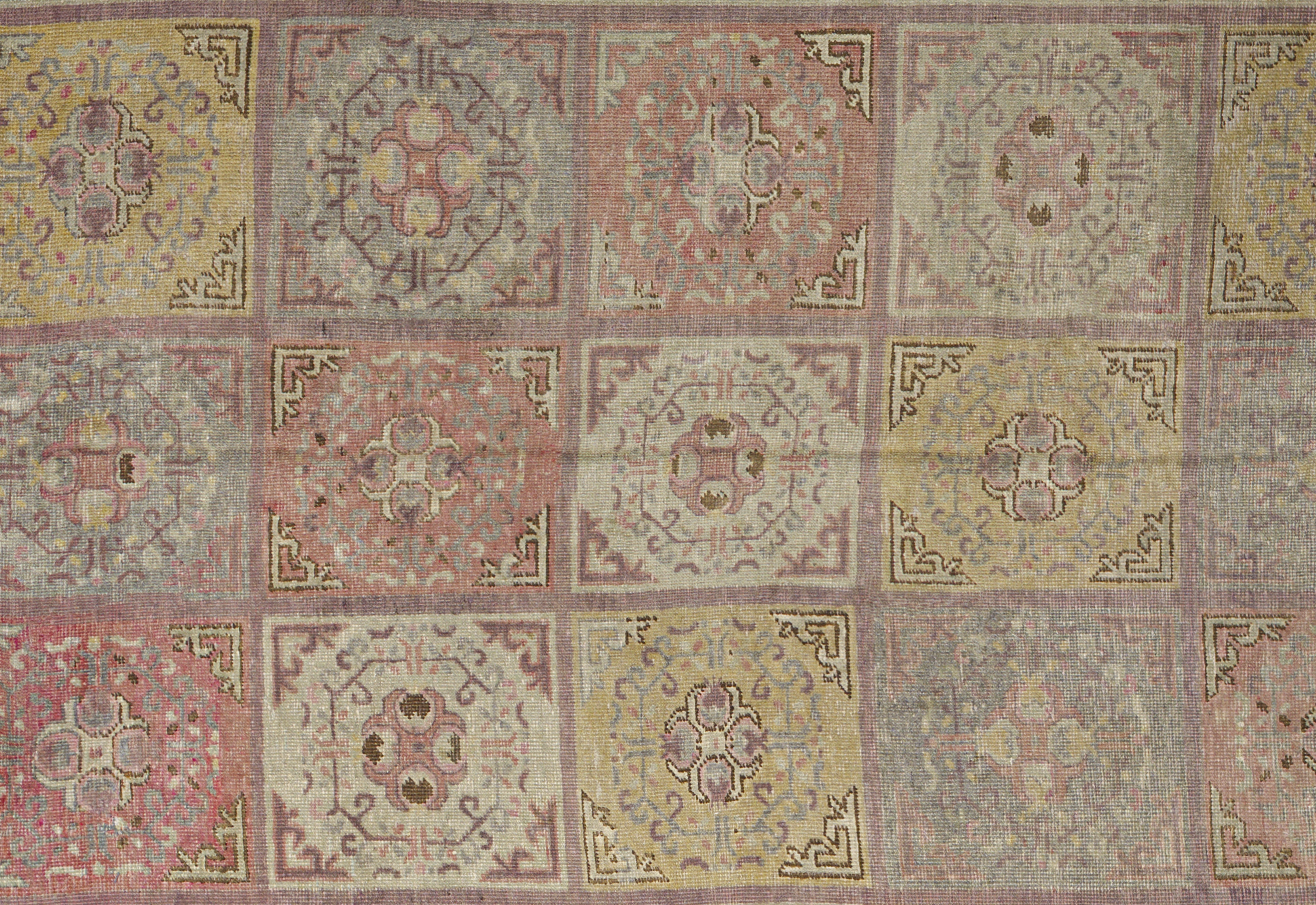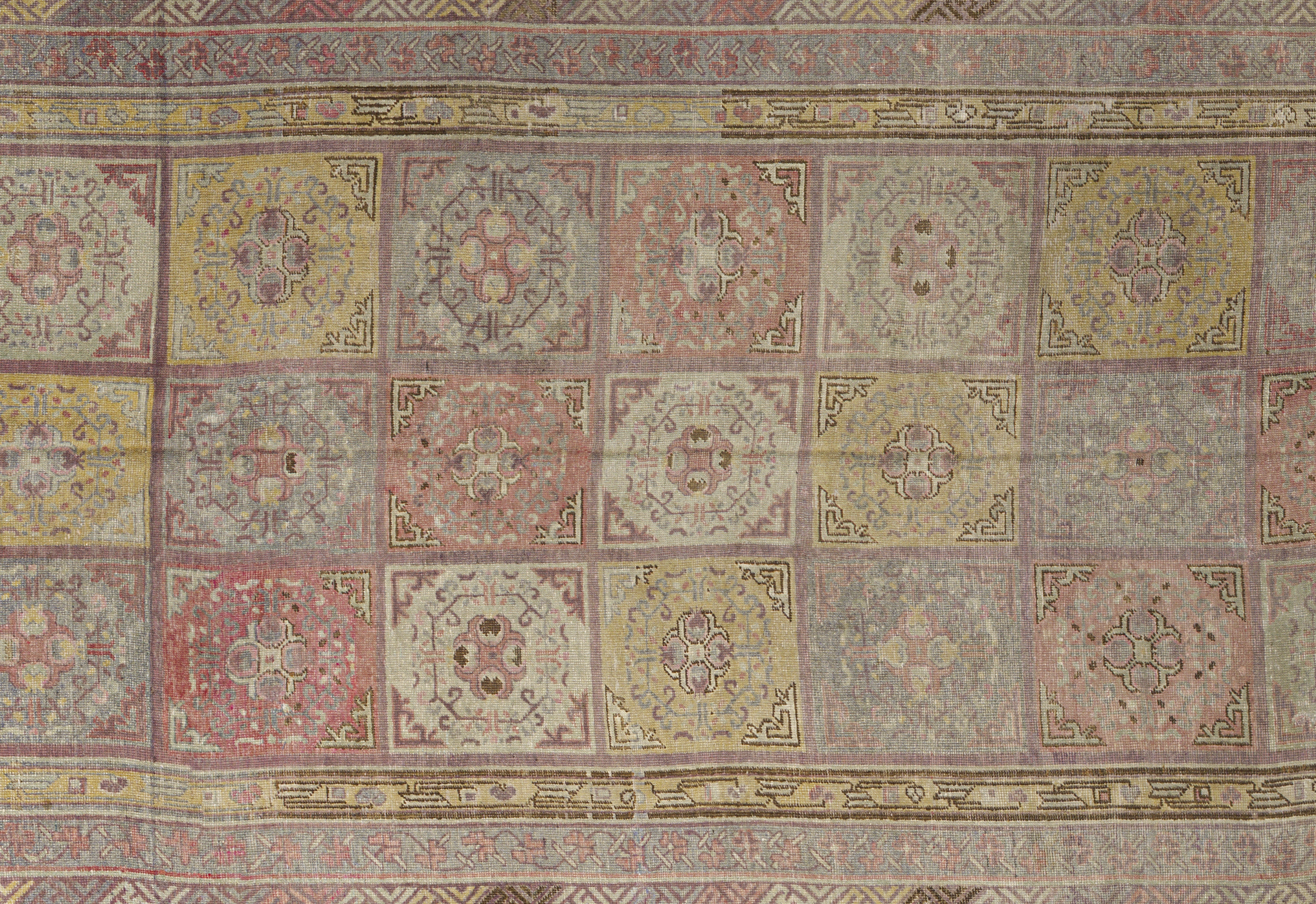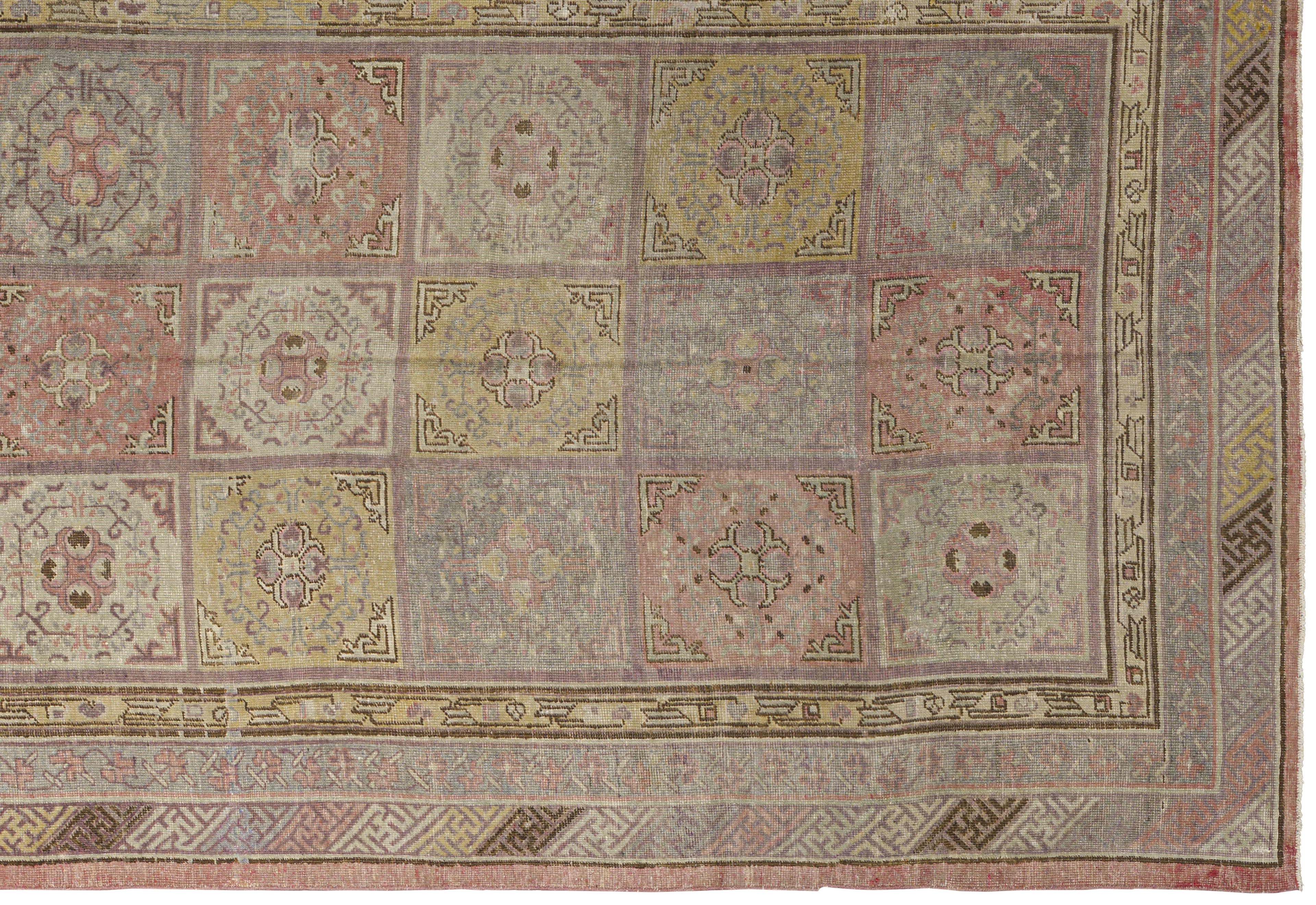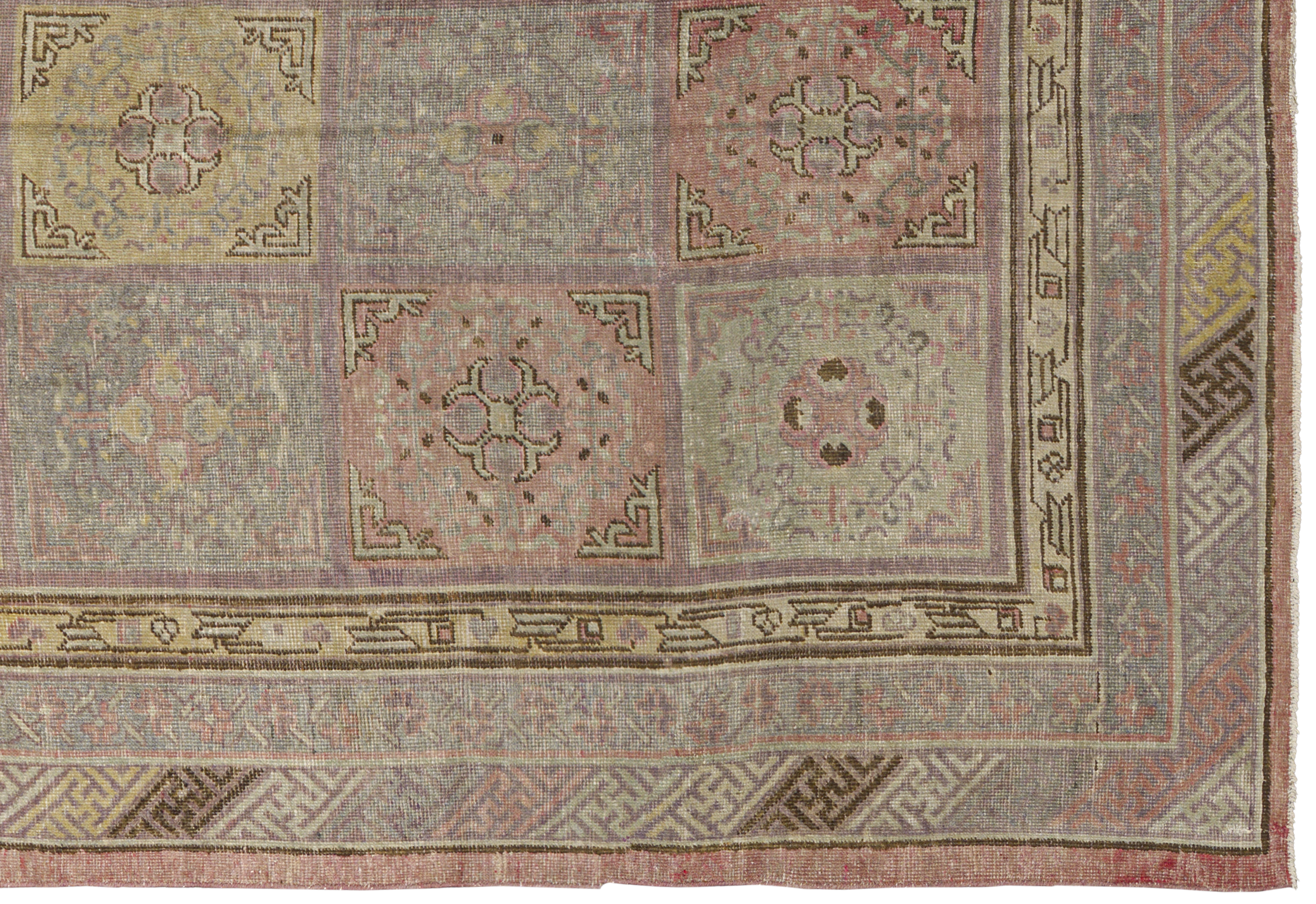Antique Russia (Khotan) wool area rug in muted peach and soft lavender pastels, featuring geometric square lattice panels, rosette medallions, and fretwork borders. High-durability, medium-pile luxury piece ideal for living rooms, dining rooms, bedrooms, libraries, studies, hallways, or galleries.