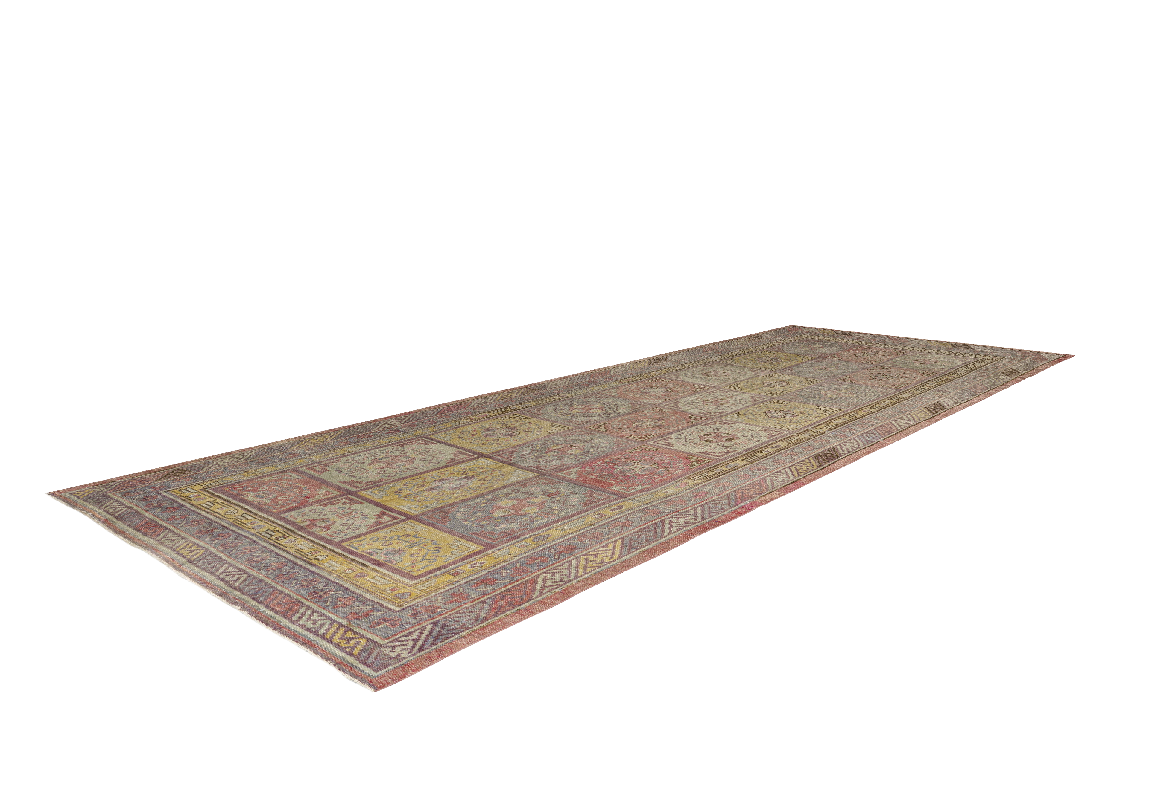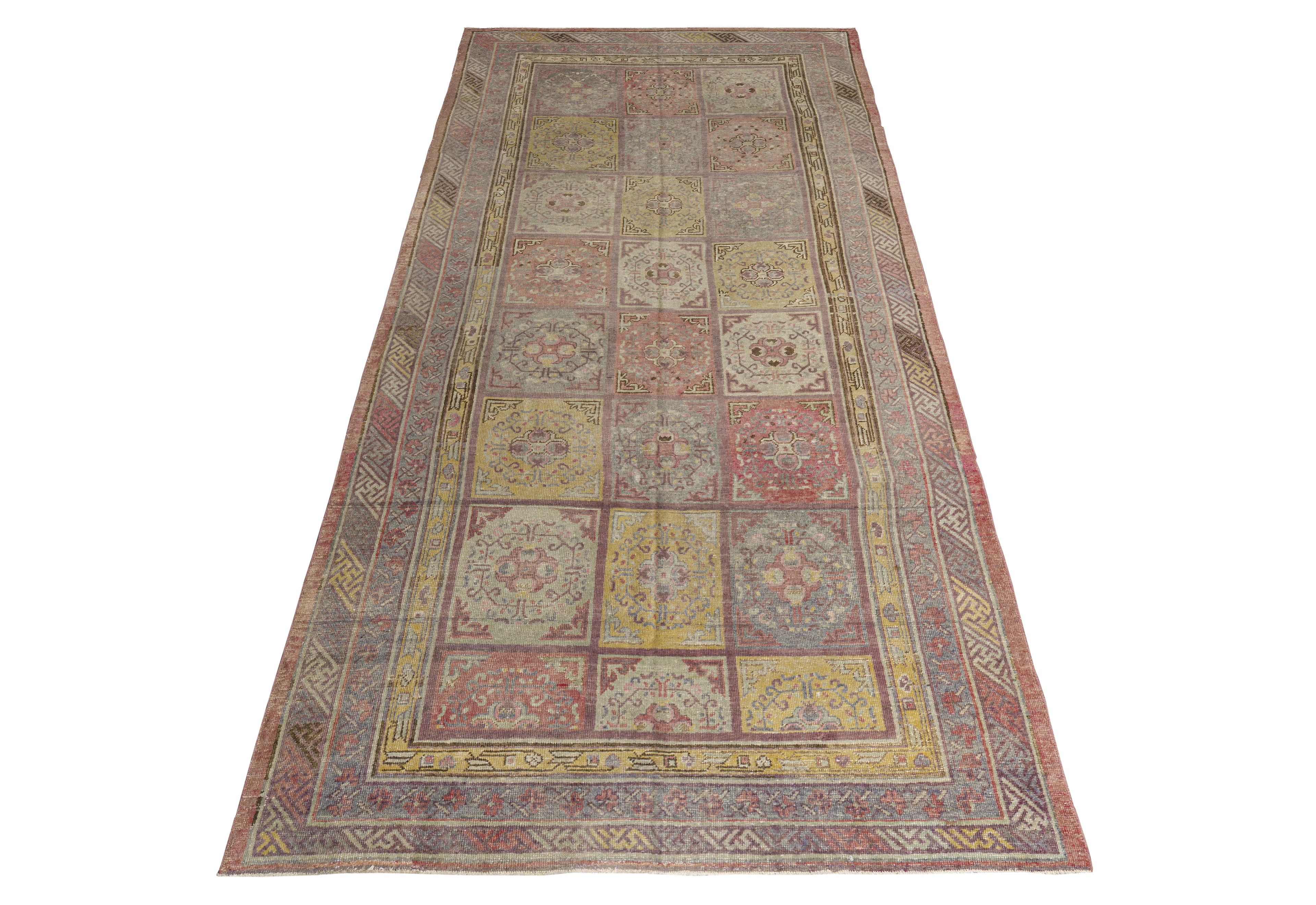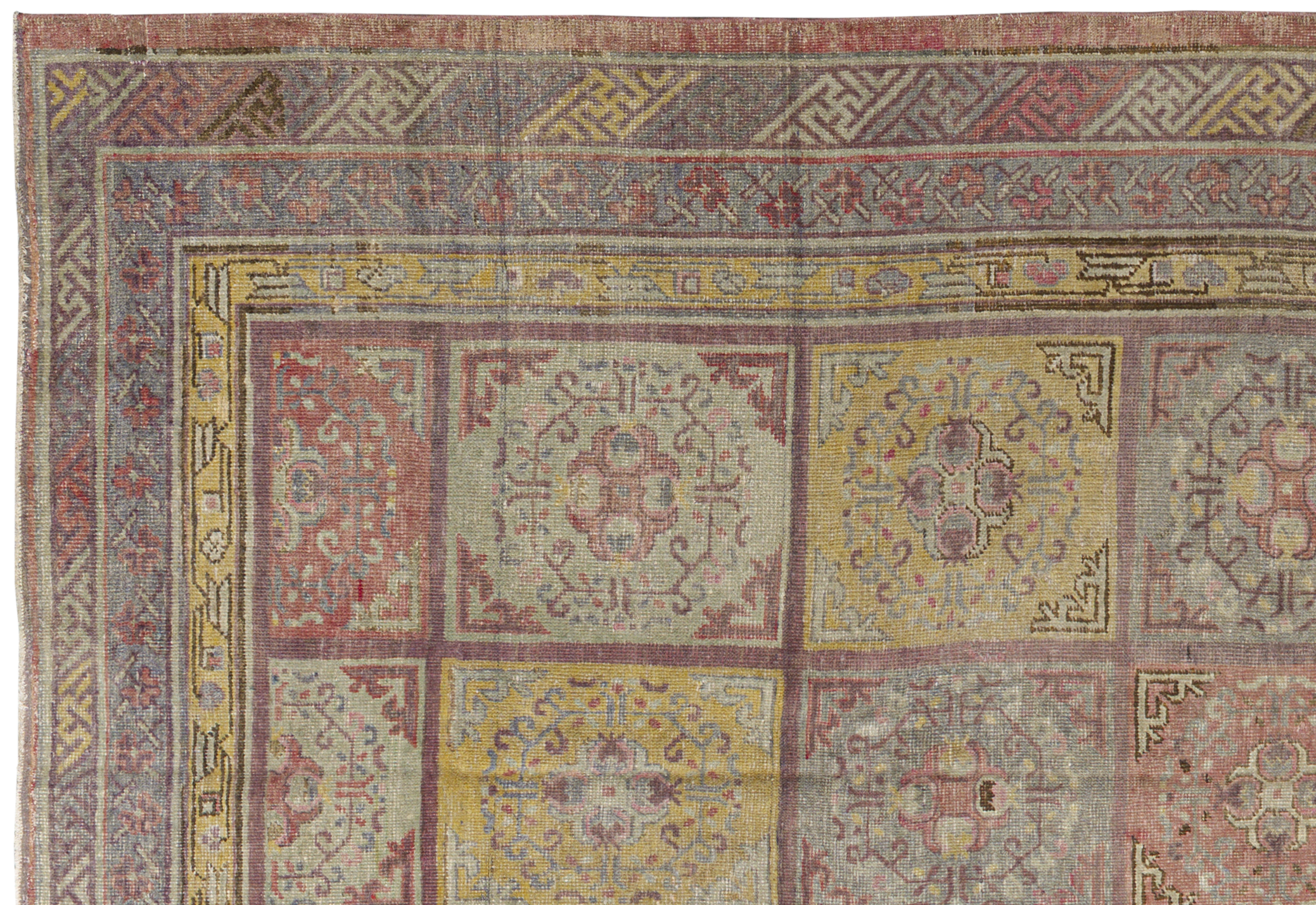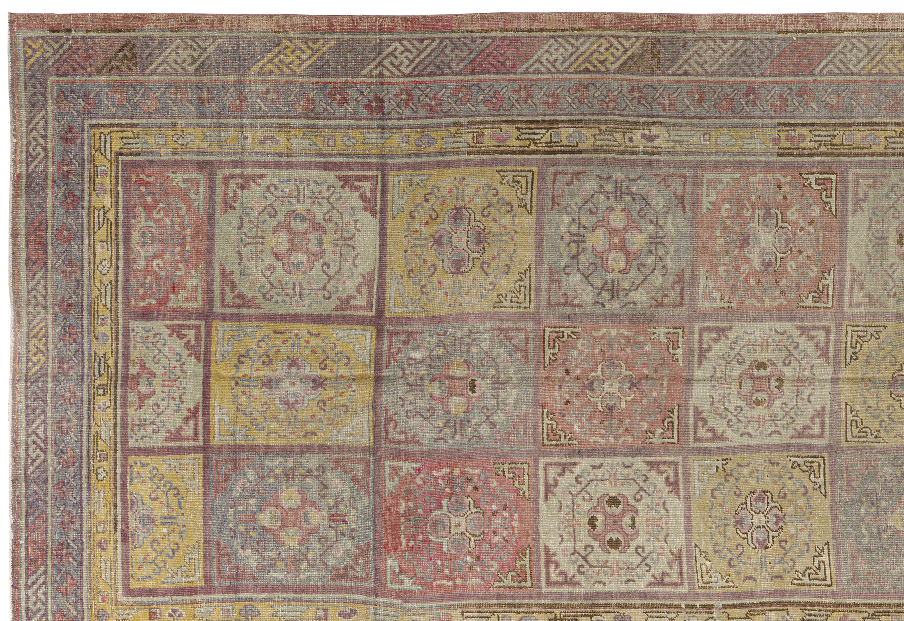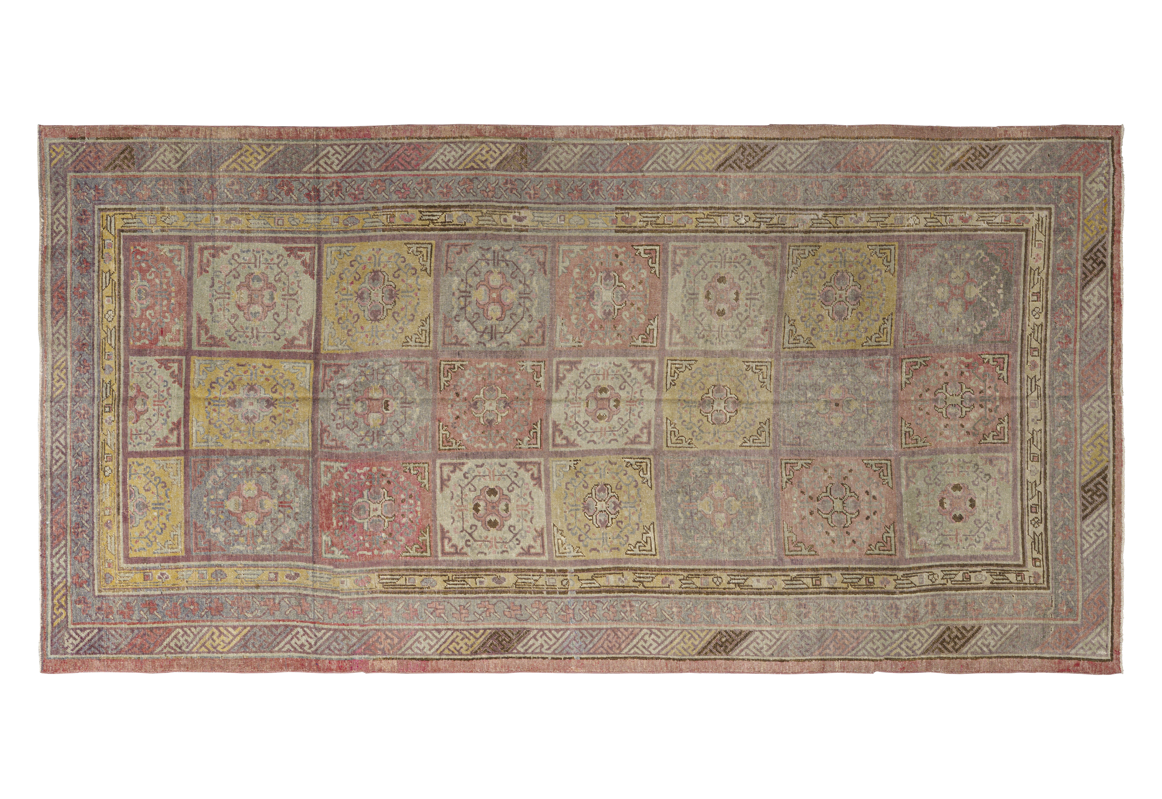 Antique Russia (Khotan) wool area rug in muted peach and soft lavender pastels, featuring geometric square lattice panels, rosette medallions, and fretwork borders. High-durability, medium-pile luxury piece ideal for living rooms, dining rooms, bedrooms, libraries, studies, hallways, or galleries.