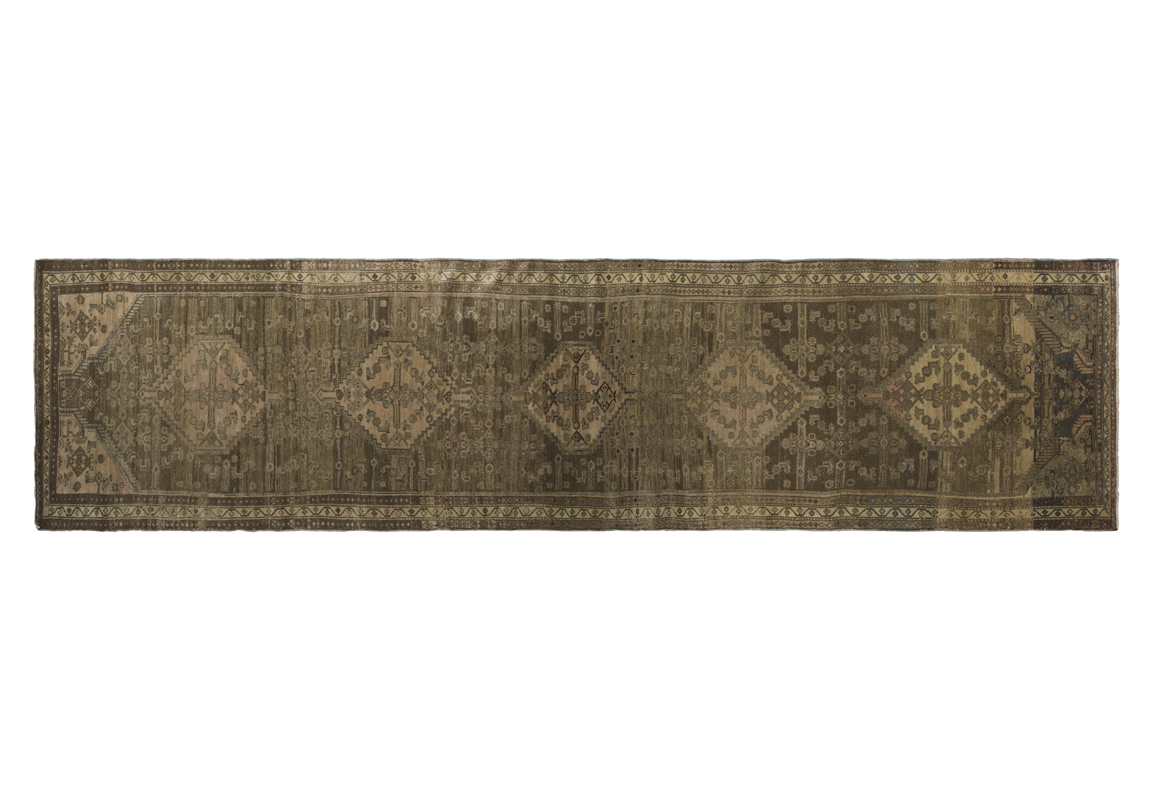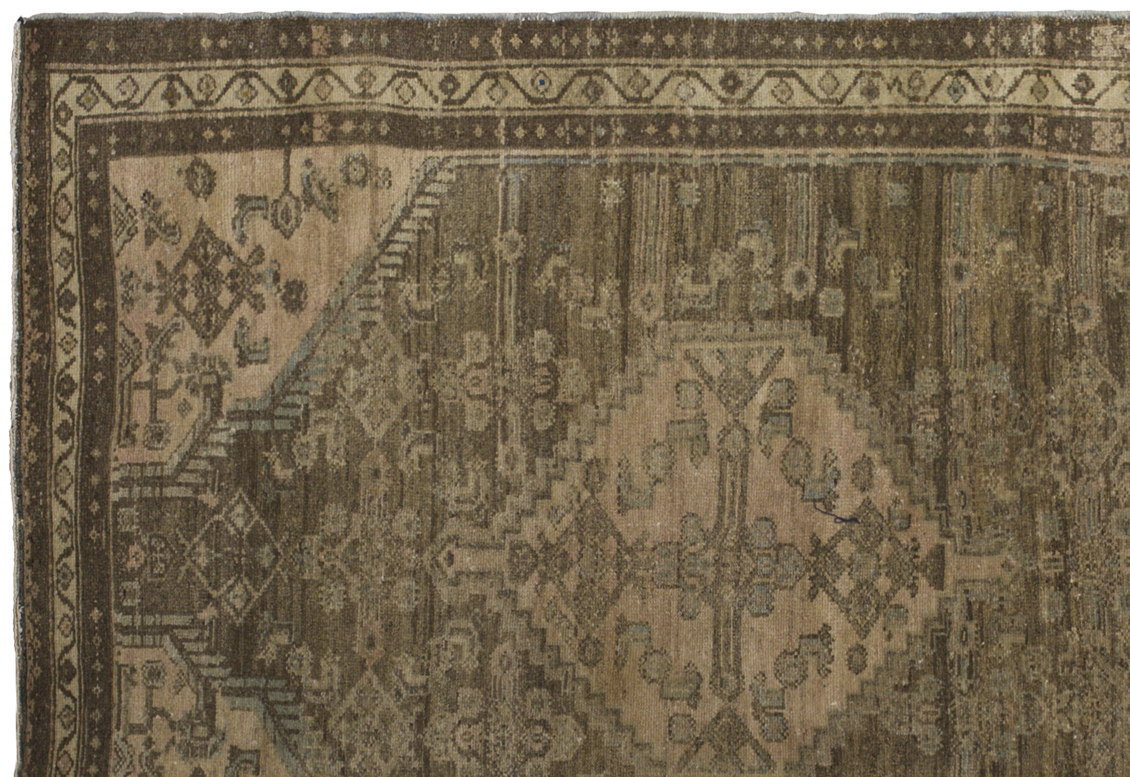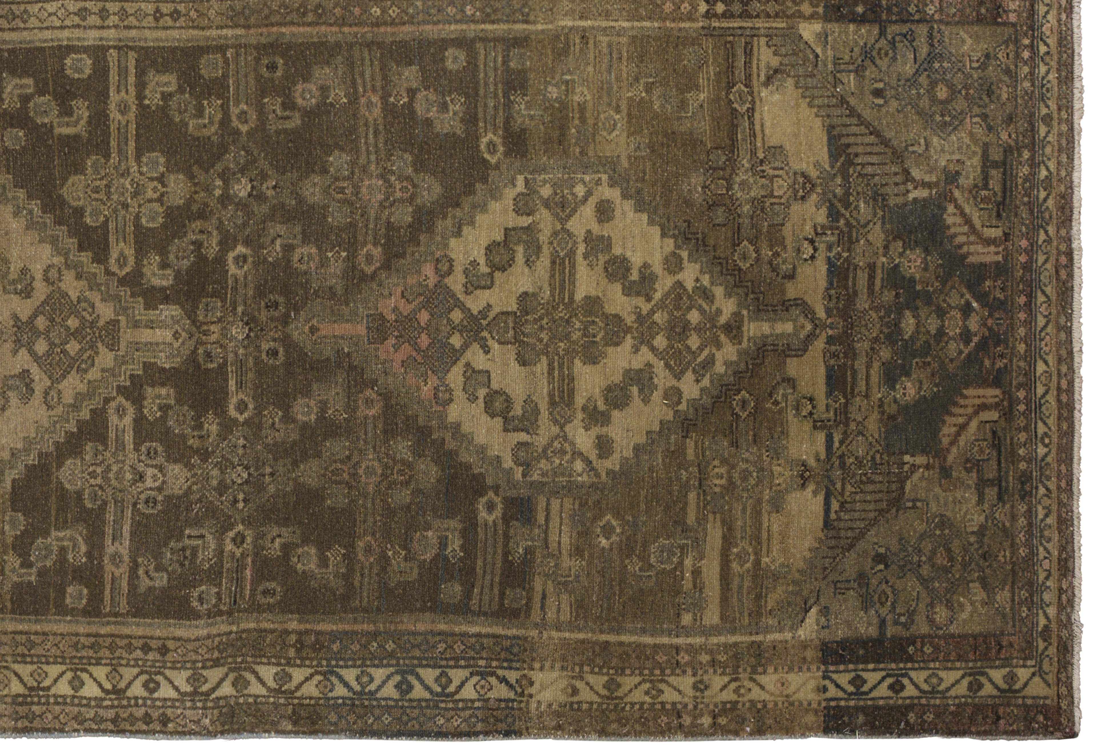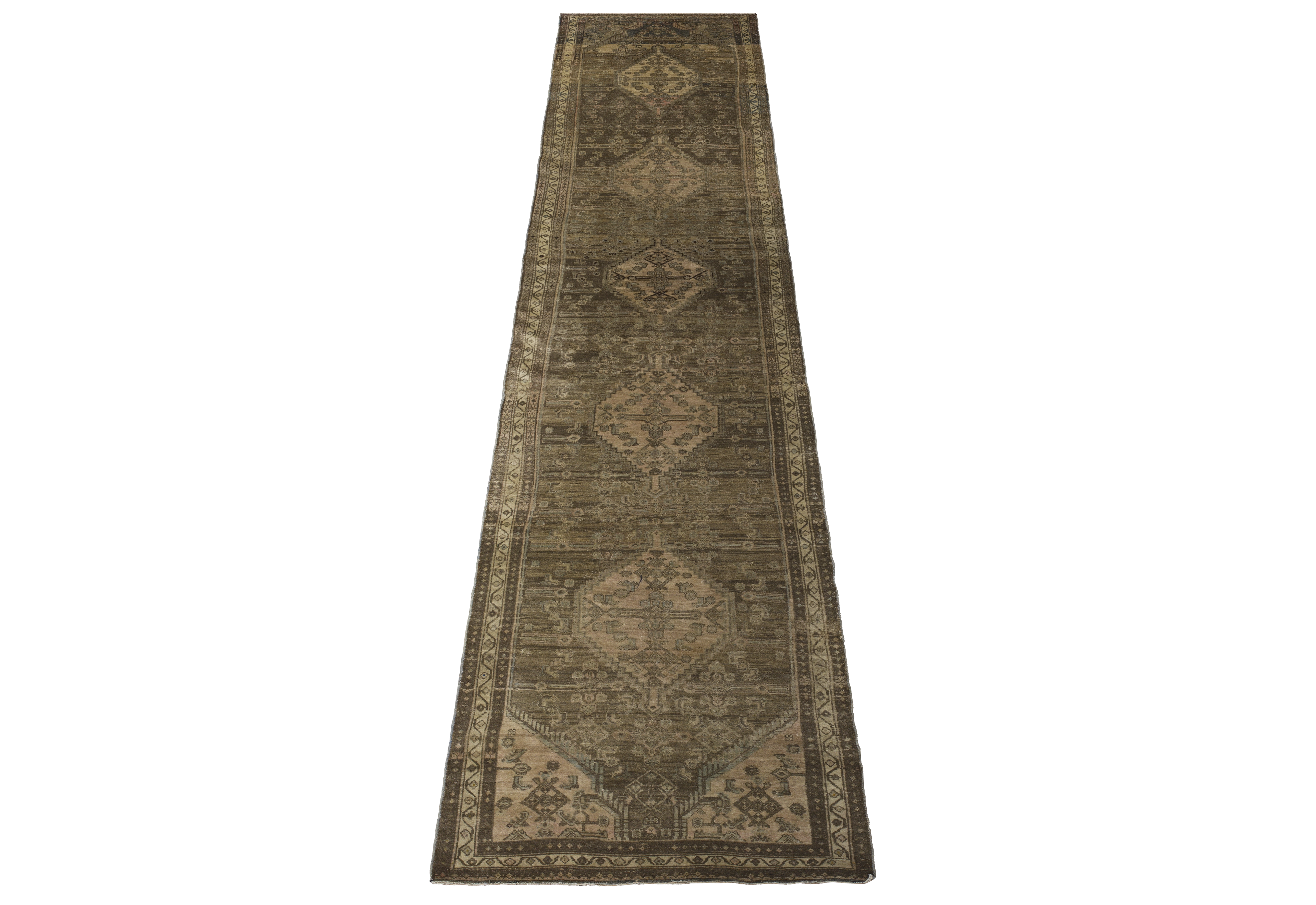 Antique tribal runner from Persian Malayer, crafted in wool with a gallery runner proportion (3 ft 8 in x 15 ft 4 in). Toasted almond and desert sand tones form a geometric medallion layout with chained diamonds, scattered angular motifs, and tribal borders for a balanced, earthy aesthetic. Sturdy construction, medium pile, and a durable, easy-care fiber profile support its premium positioning and long-term use in hallways and larger rooms.