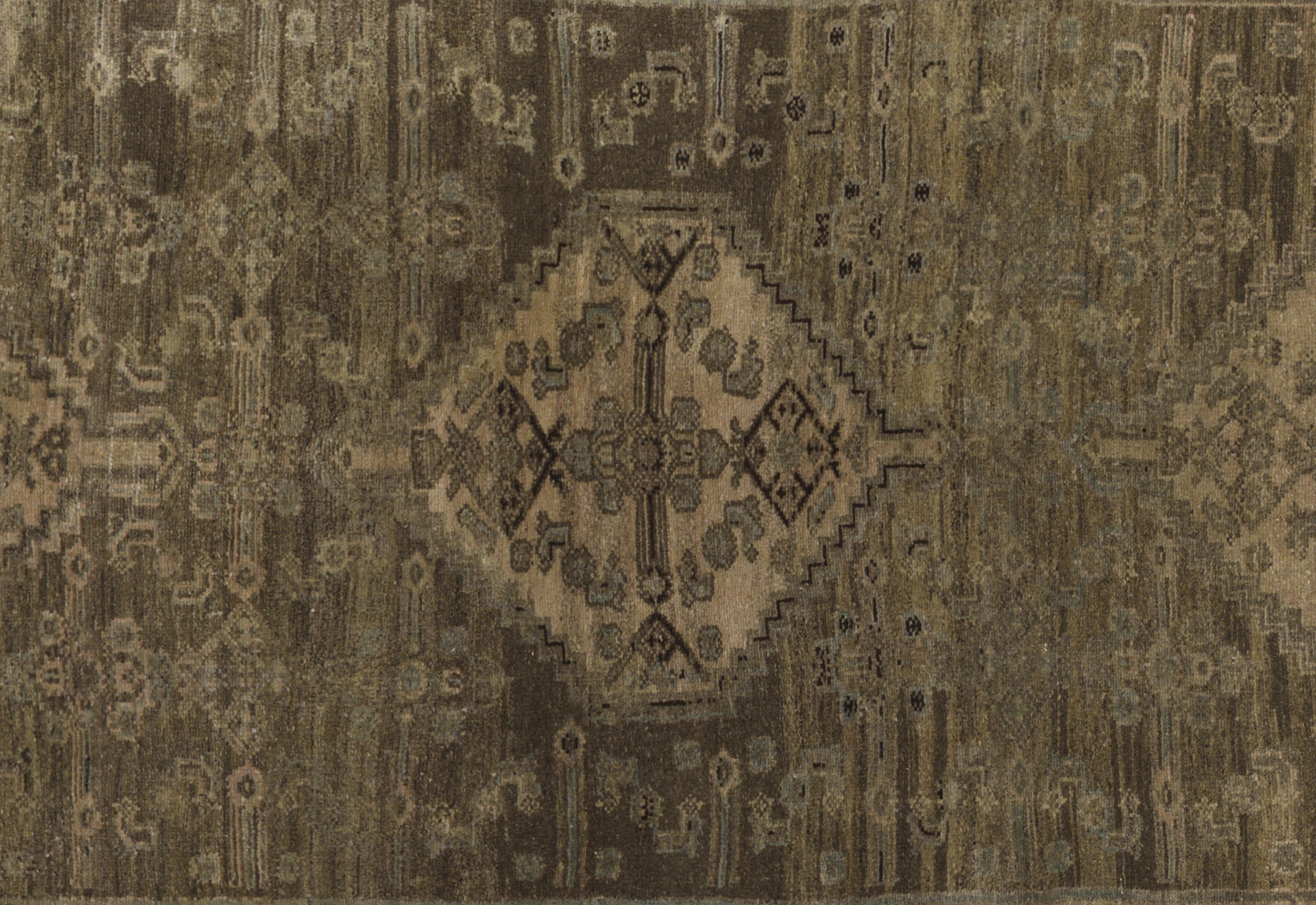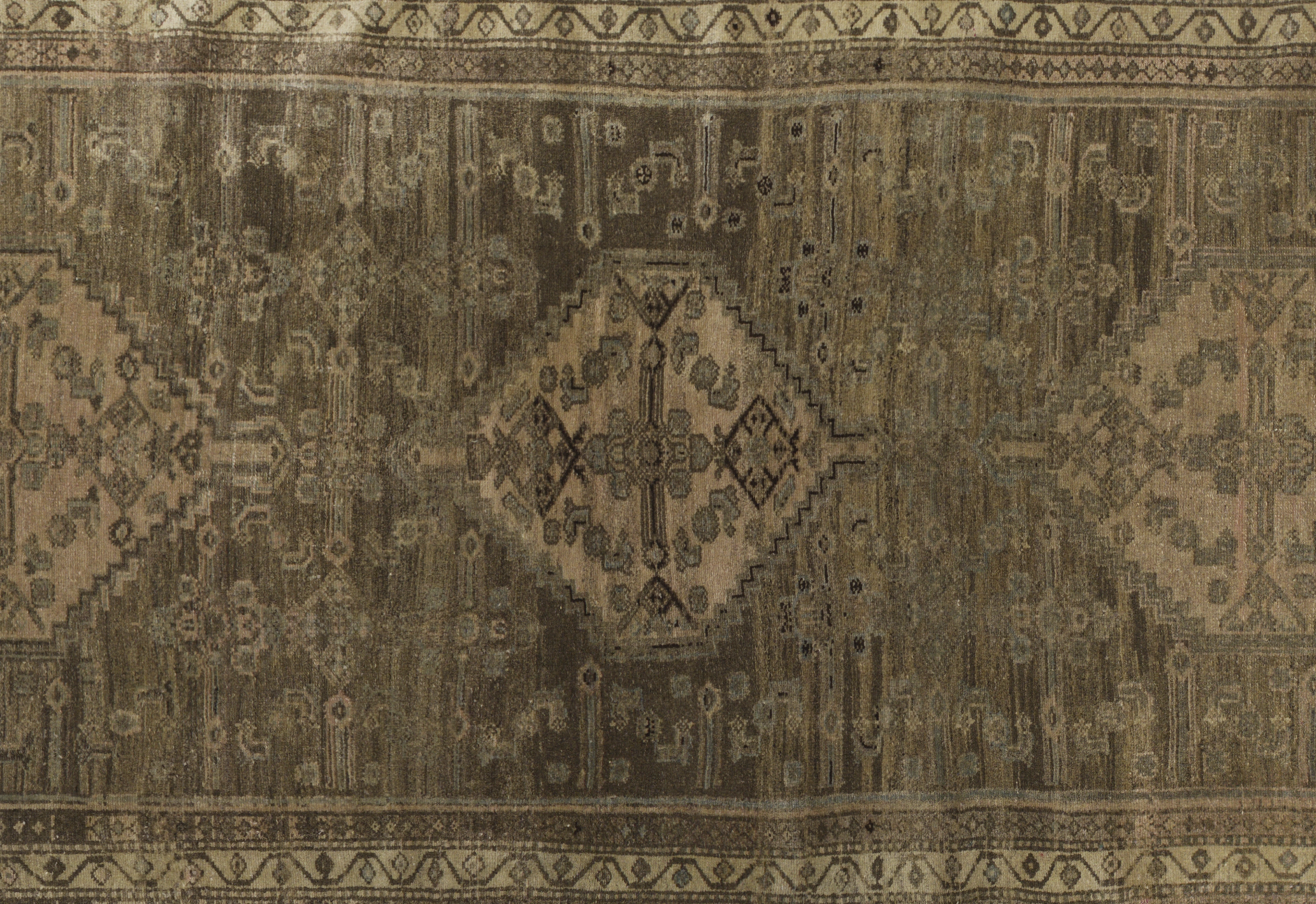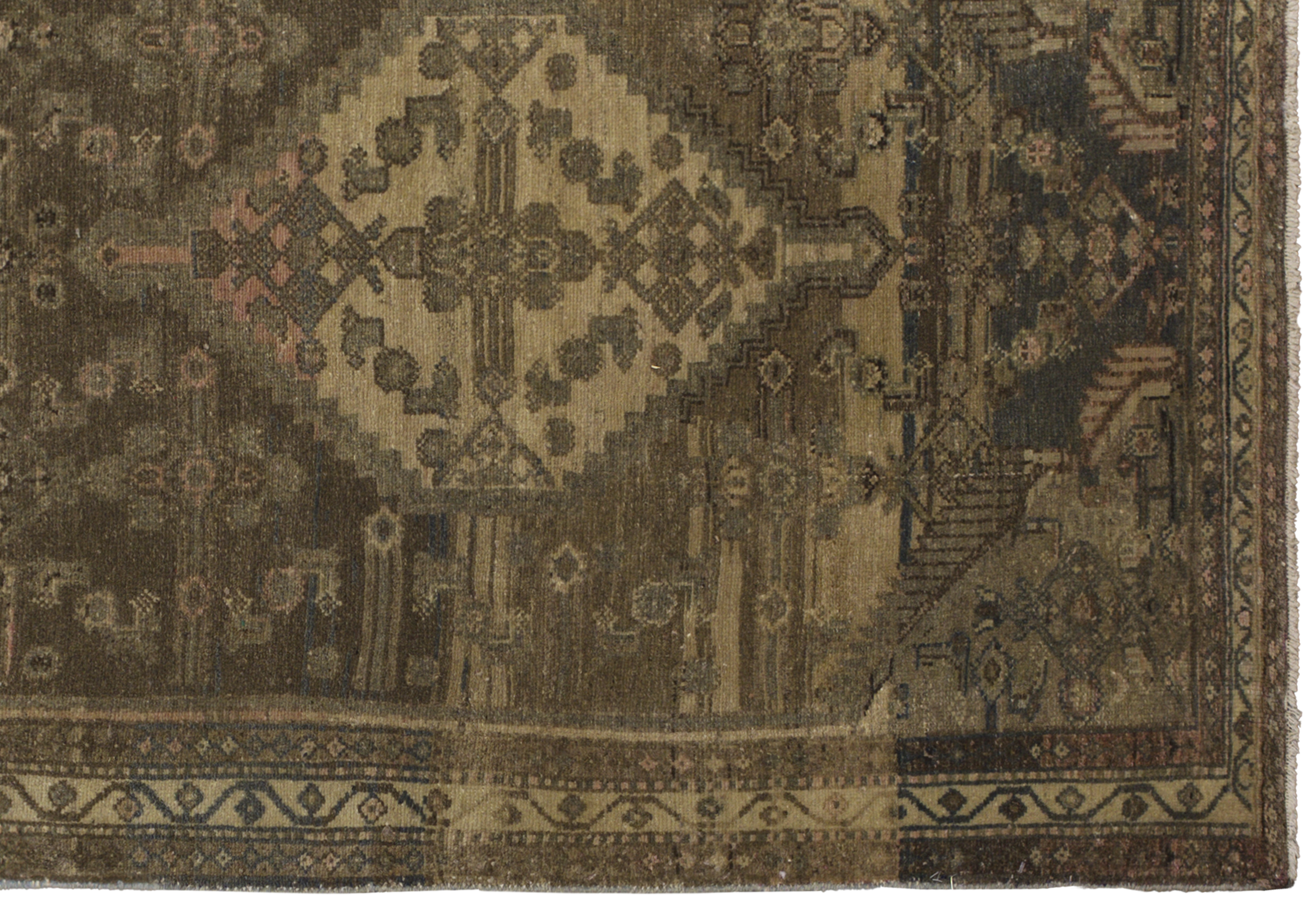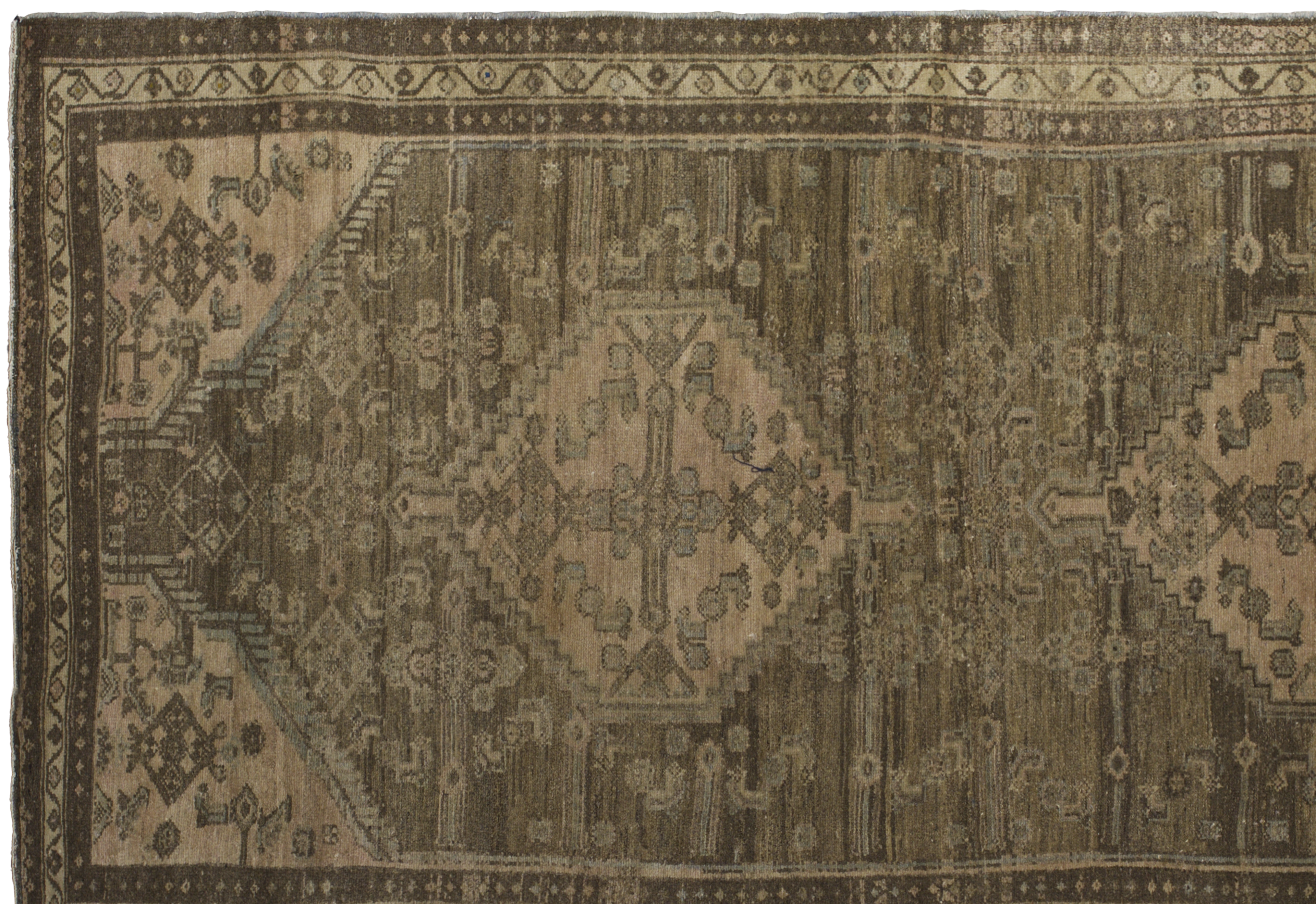 Antique tribal runner from Persian Malayer, crafted in wool with a gallery runner proportion (3 ft 8 in x 15 ft 4 in). Toasted almond and desert sand tones form a geometric medallion layout with chained diamonds, scattered angular motifs, and tribal borders for a balanced, earthy aesthetic. Sturdy construction, medium pile, and a durable, easy-care fiber profile support its premium positioning and long-term use in hallways and larger rooms.