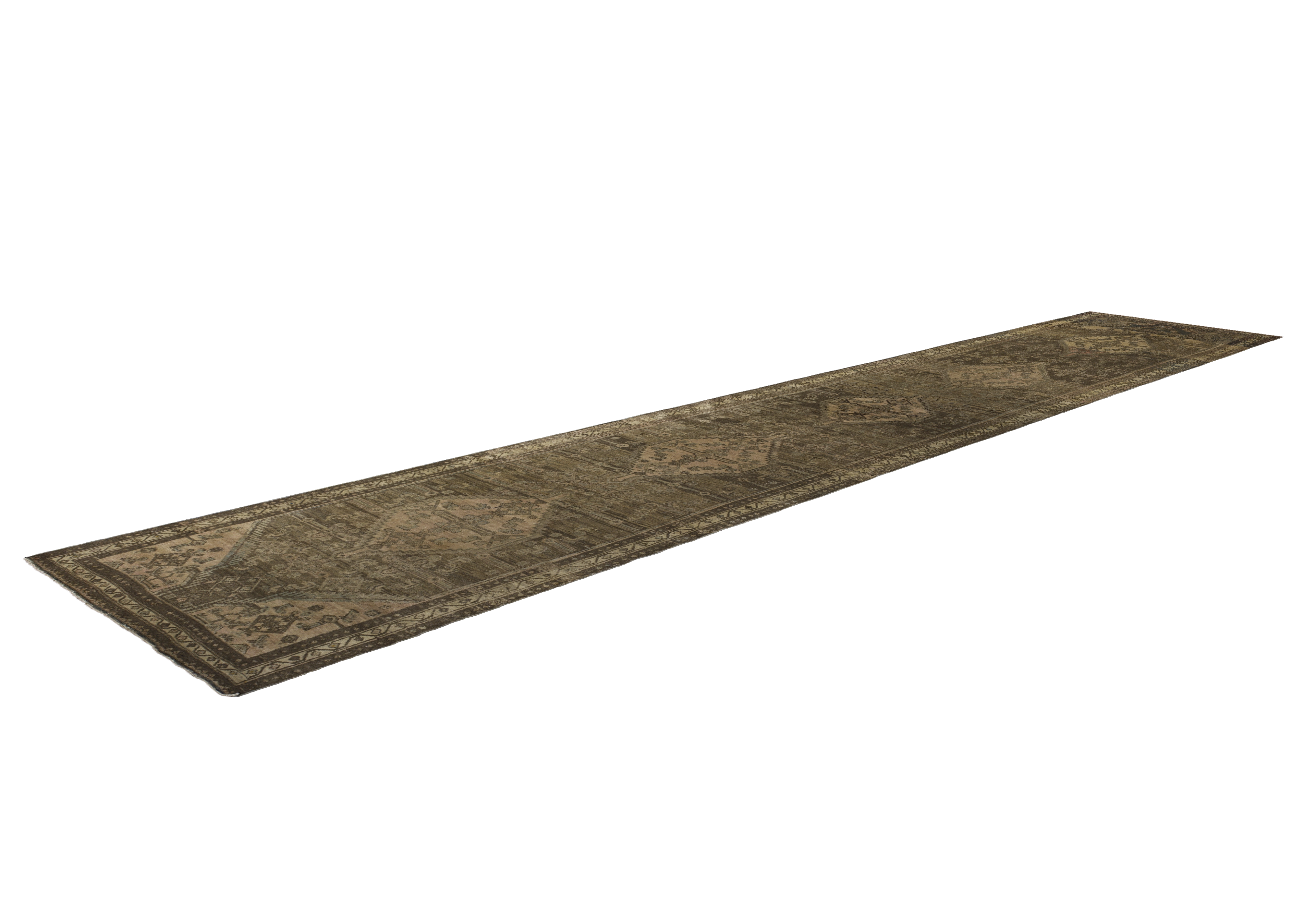 Design details include central stepped diamond medallions, hooked geometric elements, angular vine scrolls, small rosettes, border meanders, and tribal guard stripes. The elongated gallery runner format suits hallways, entryways, gallery corridors, living rooms, dining rooms, and bedrooms, adding a warm, grounded tribal character to transitional paths and seating areas.
