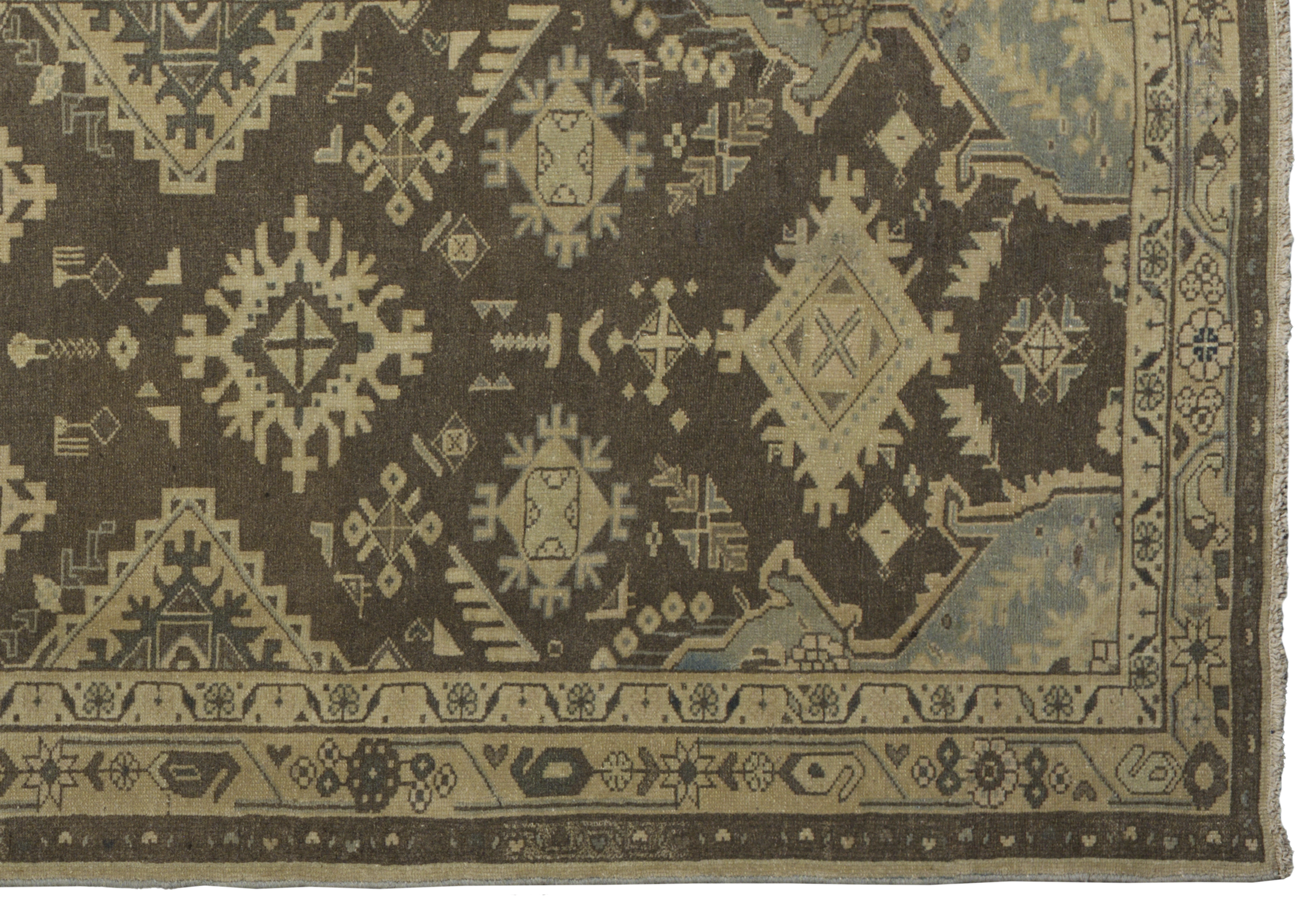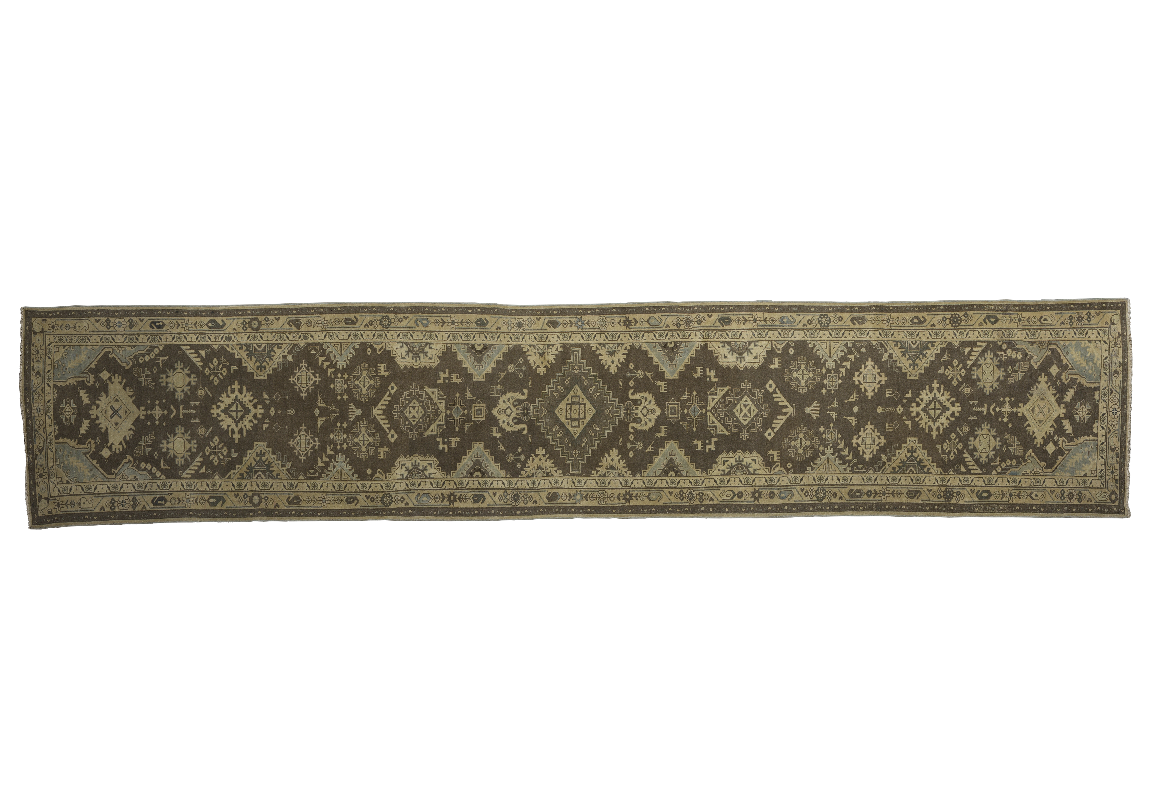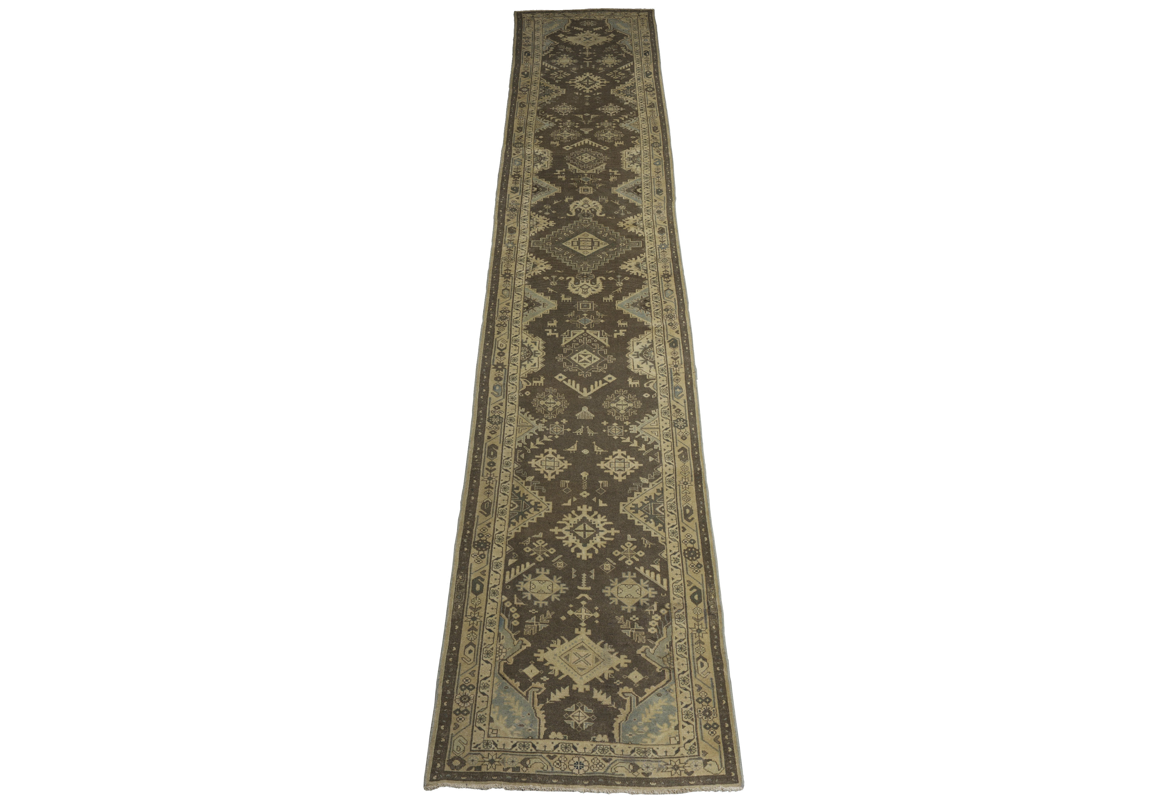 Antique Persian Malayer wool gallery runner (c. 1900–1920) in cocoa brown with pale parchment and light blue accents. Features stepped diamond medallions, angular floral and star motifs, hooked polygons, animal figures, and stylized leaves in a traditional geometric style. Durable, medium-pile wool construction in a large runner format (approx. 3’6″ x 17’10”), suited to premium interiors and high-traffic corridors.