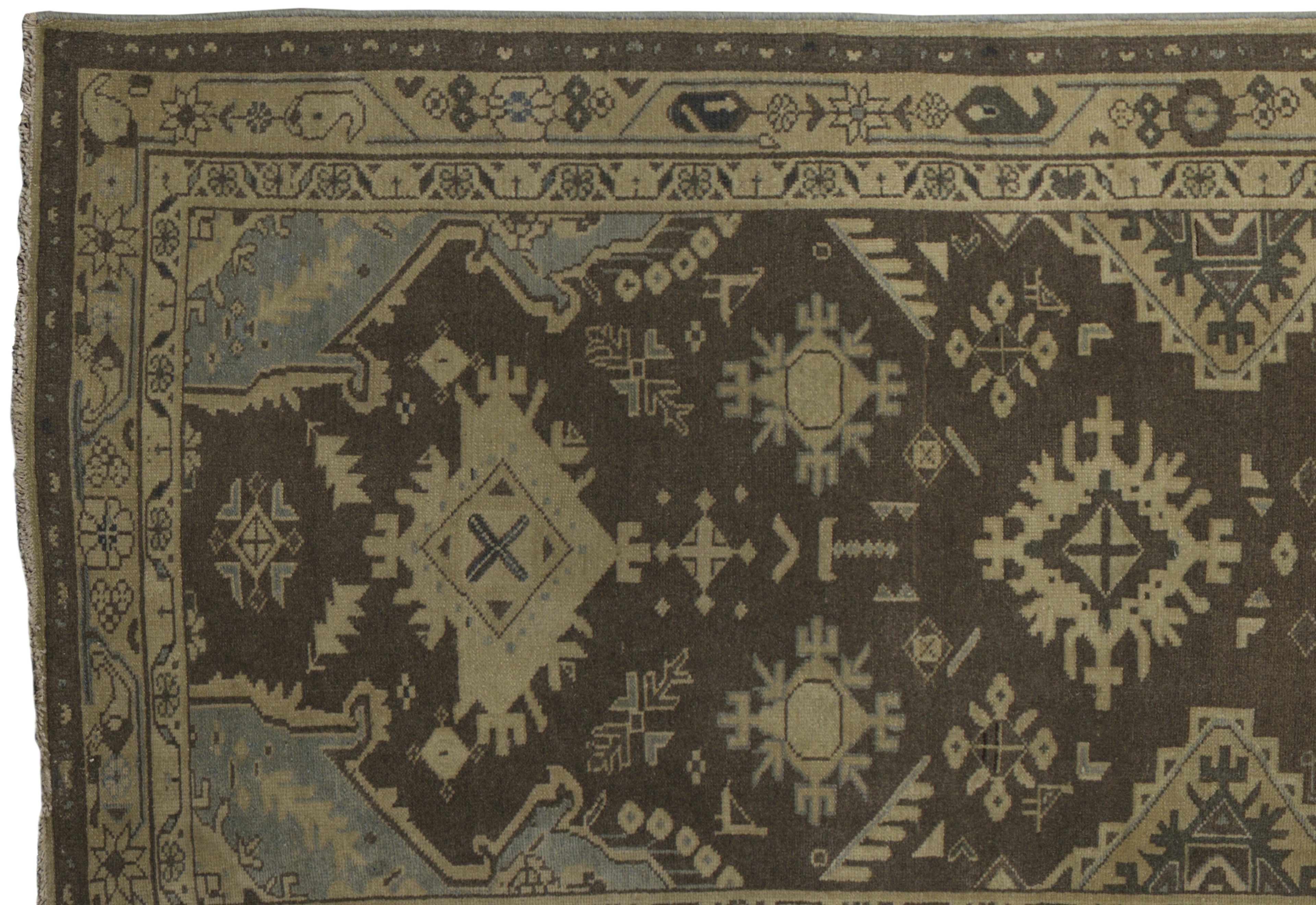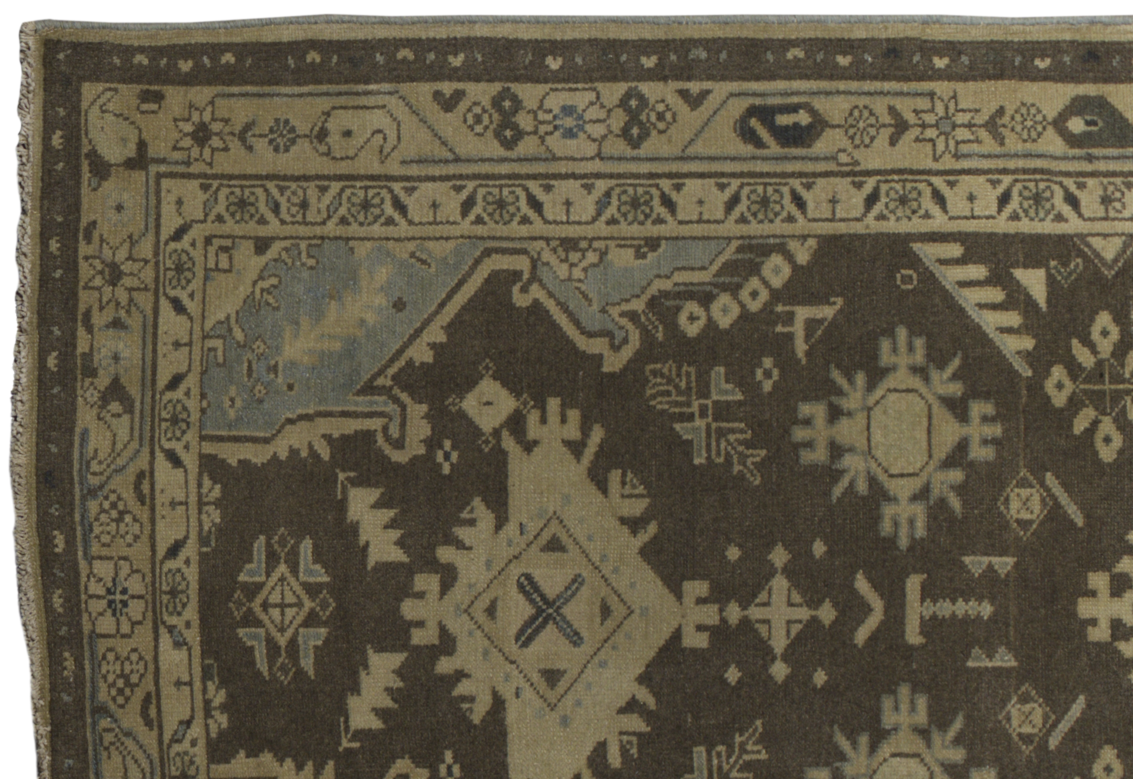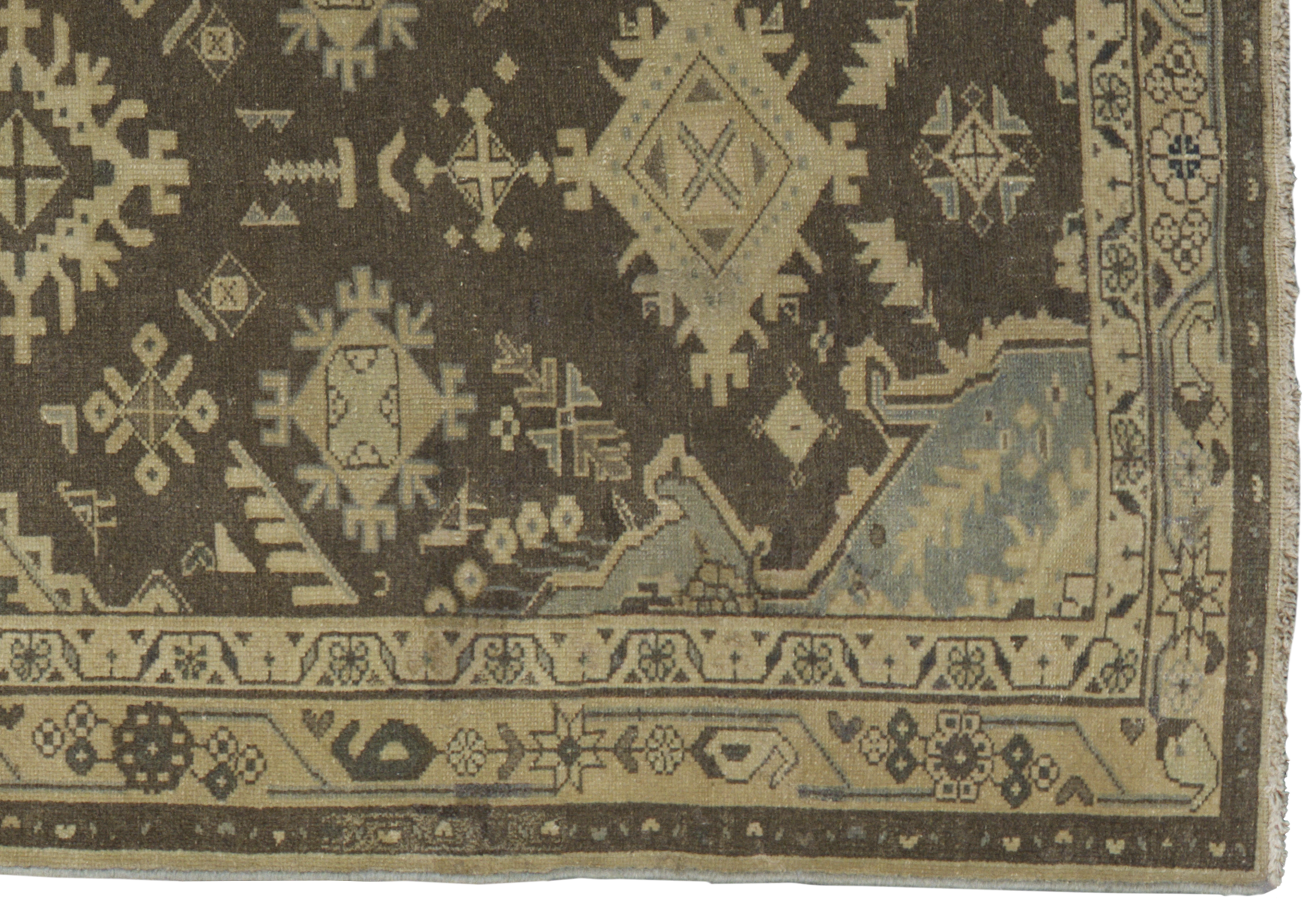 Antique Persian Malayer wool gallery runner (c. 1900–1920) in cocoa brown with pale parchment and light blue accents. Features stepped diamond medallions, angular floral and star motifs, hooked polygons, animal figures, and stylized leaves in a traditional geometric style. Durable, medium-pile wool construction in a large runner format (approx. 3’6″ x 17’10”), suited to premium interiors and high-traffic corridors.