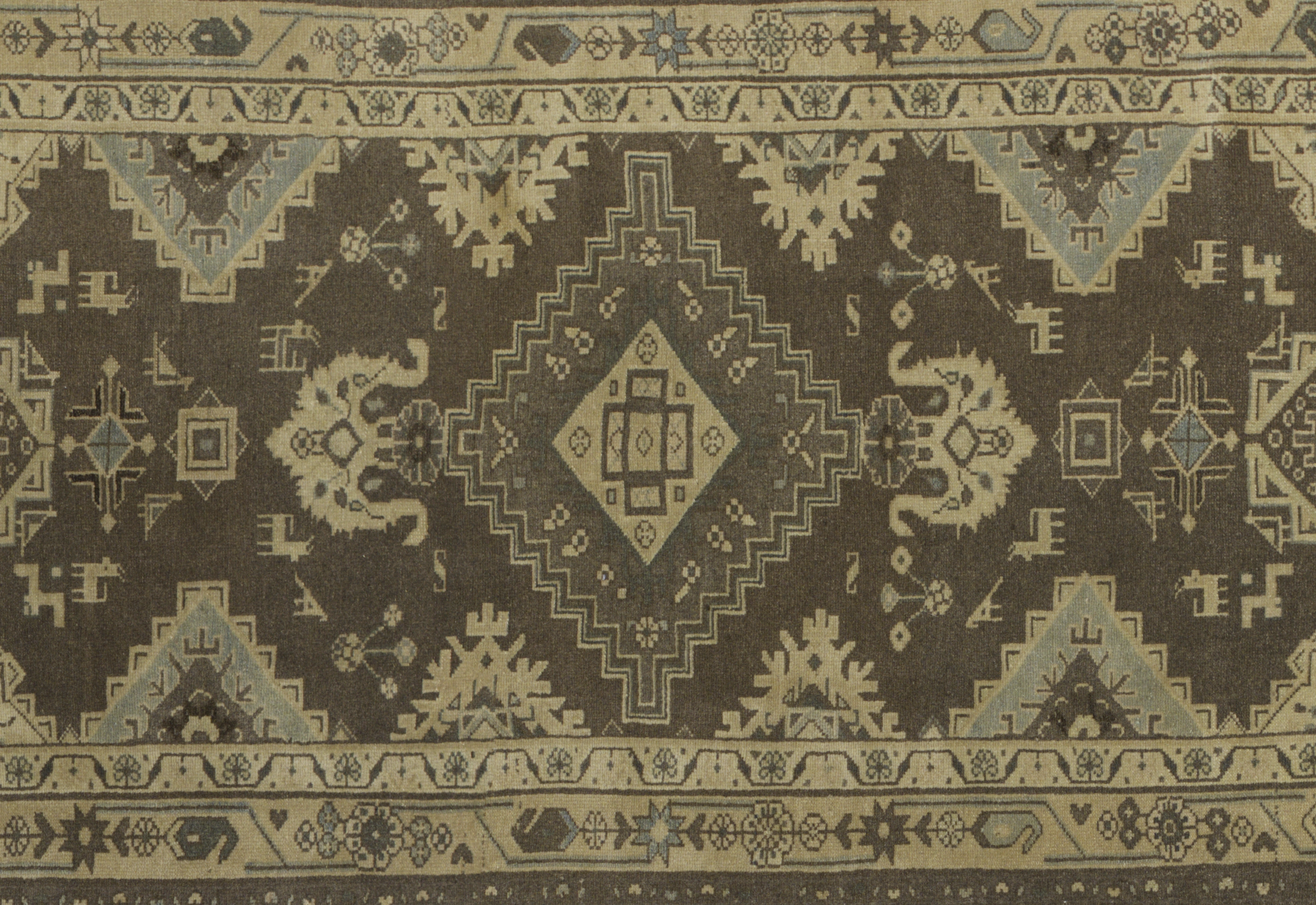Durable antique medium-pile wool with easily repairable construction, moth-resistant fiber, and age-consistent wear typical of early 20th-century pieces.