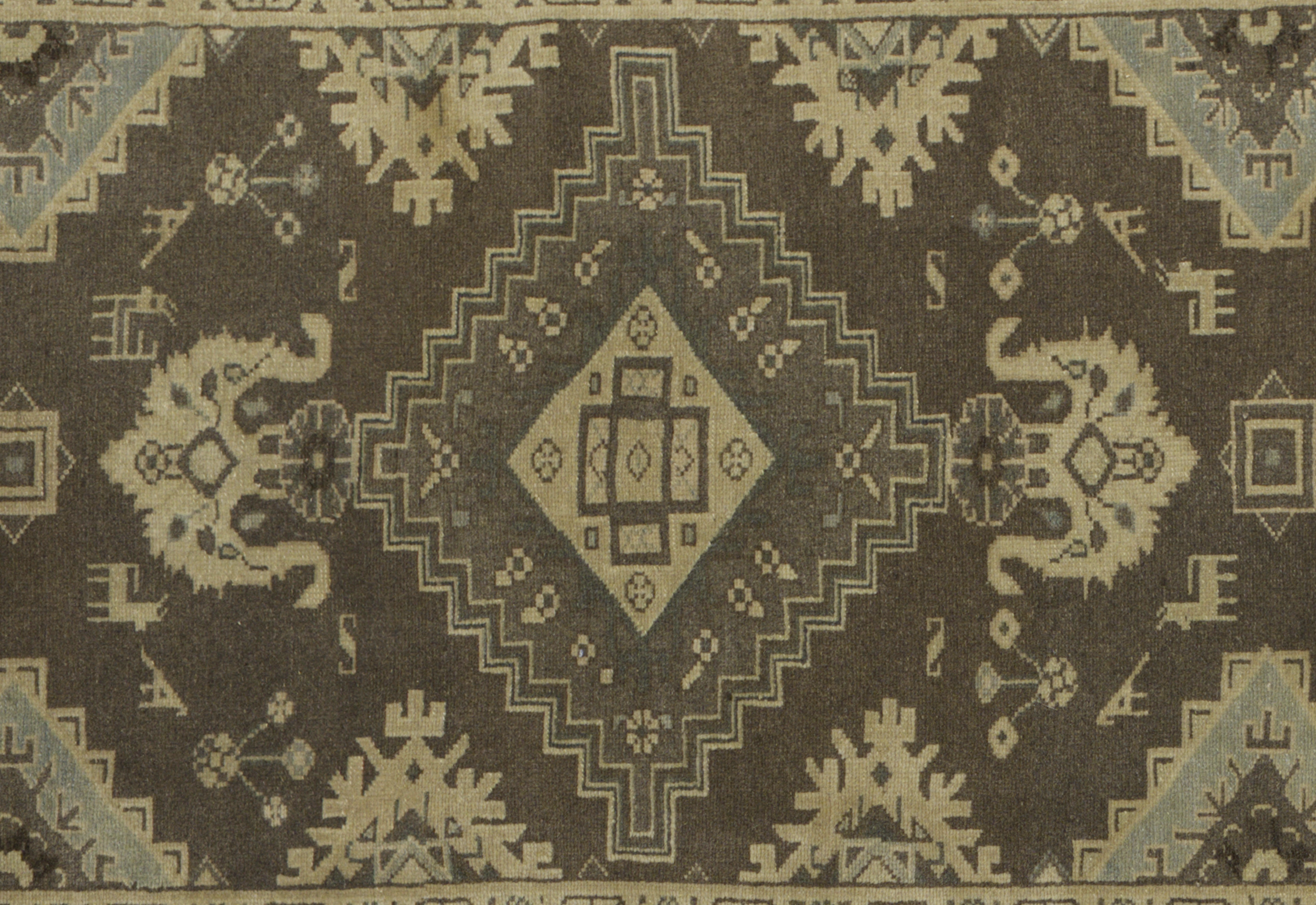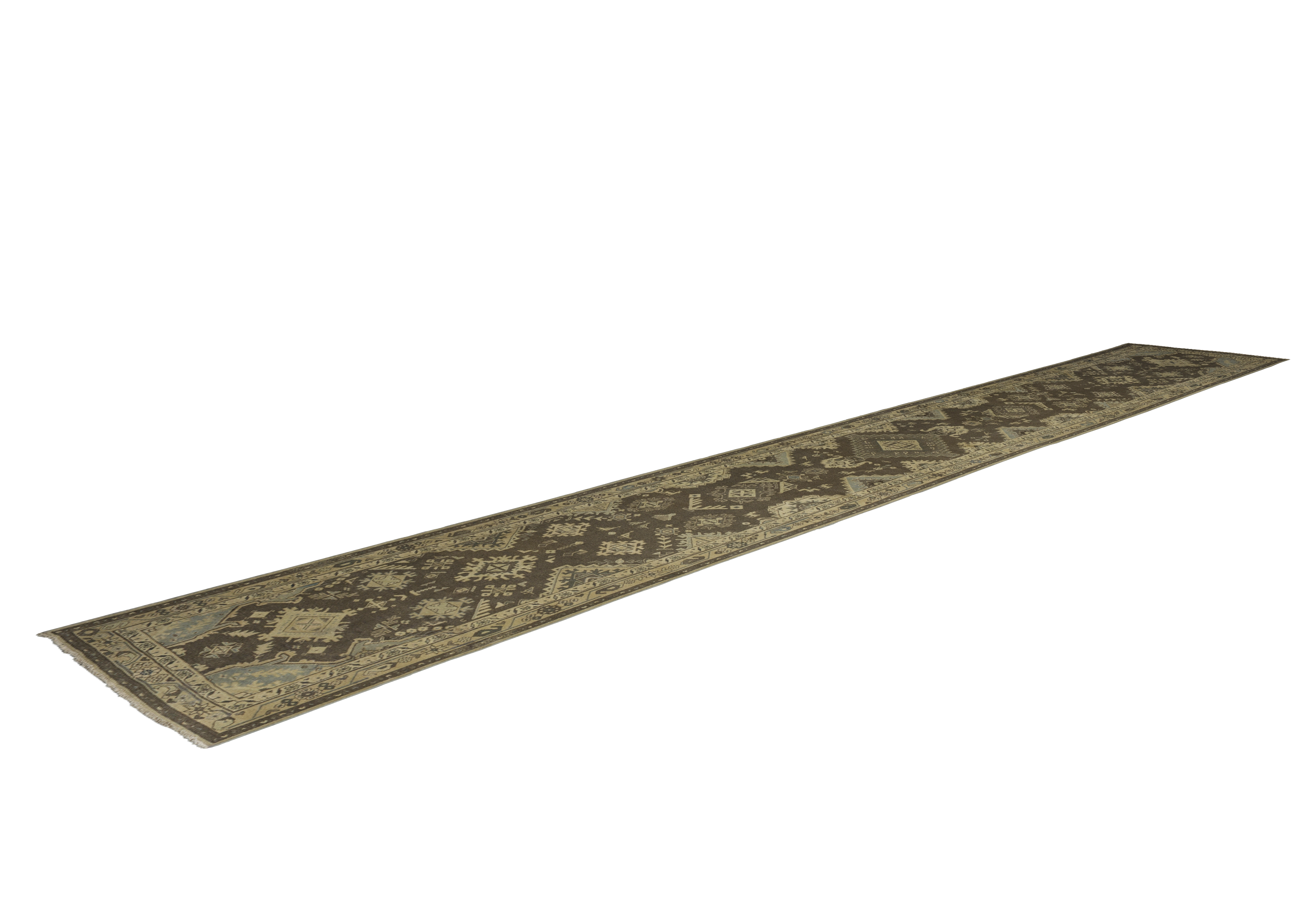 Motifs include stepped diamond medallions, angular star rosettes, hooked polygons, small animal figures, stylized leaf forms, and geometric border guards. Its long gallery runner shape is ideal for hallways, entryways, gallery corridors, living rooms, dining rooms, studies, and libraries, where its tribal, allover pattern delivers visual rhythm and warmth.