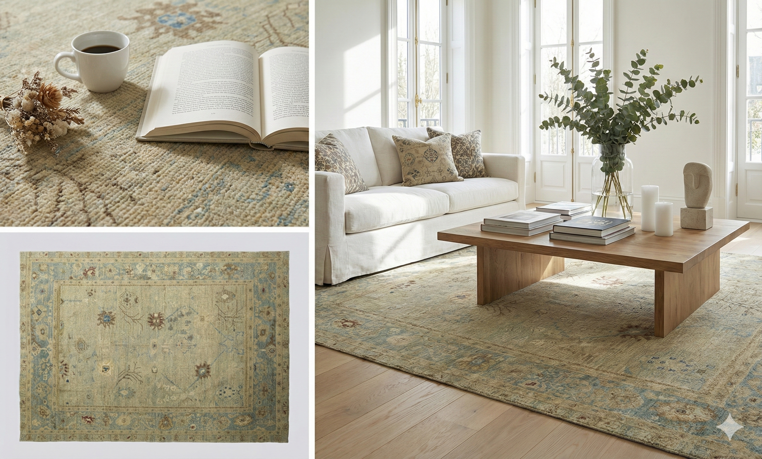 Design highlights include scattered floral and branch motifs within a wide floral border, geometric medallion traces, and mixed motifs that balance traditional Oushak character with a contemporary decorative look. Ideal for living rooms, dining rooms, bedrooms, libraries, and sitting rooms where a light yet grounded palette is desired.