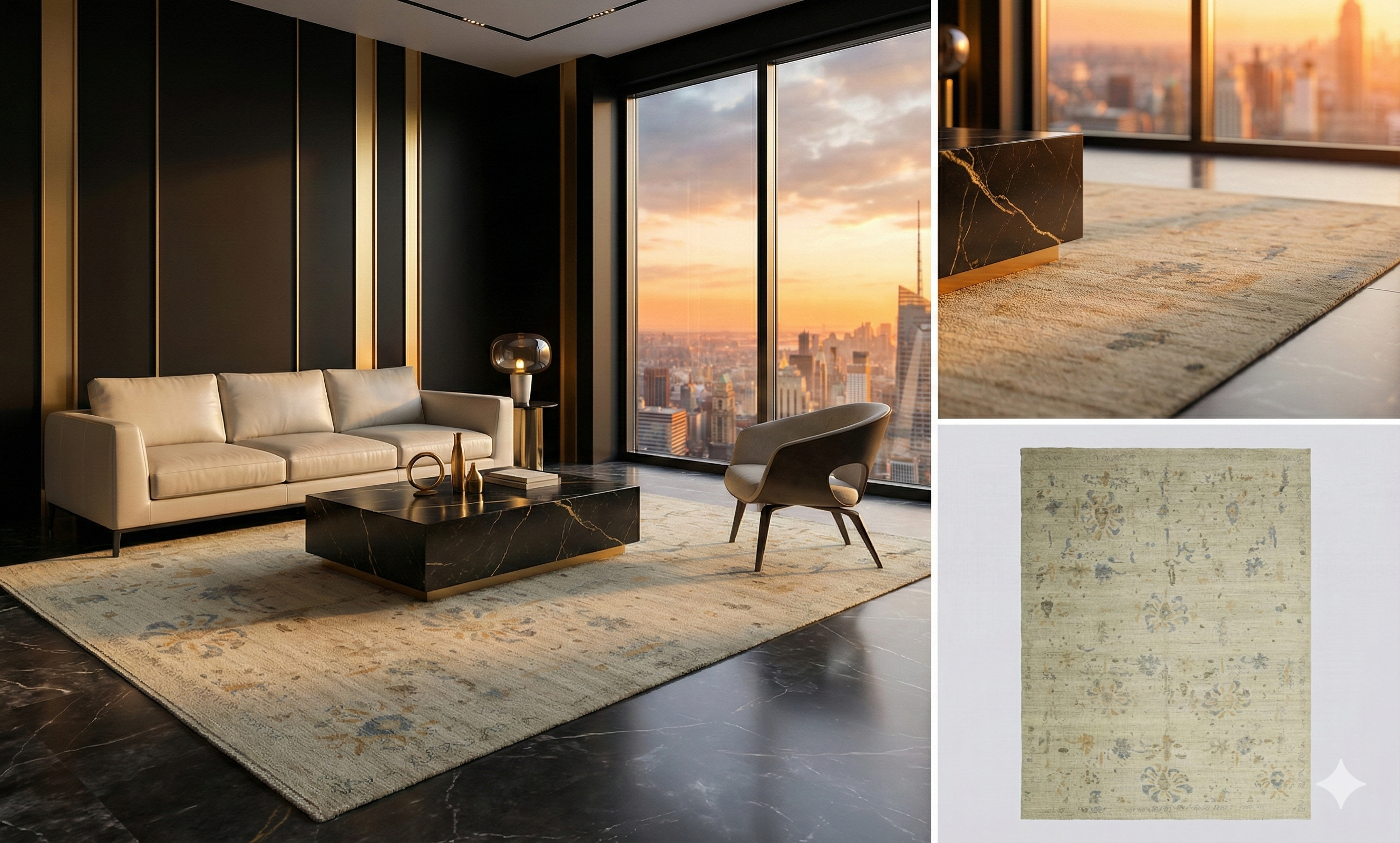 Light and airy with an earthy, neutral mood, this Oushak rug pairs a pastel parchment ground with powder blue accents and softly drawn geometric-floral motifs for an elegant yet relaxed premium look.