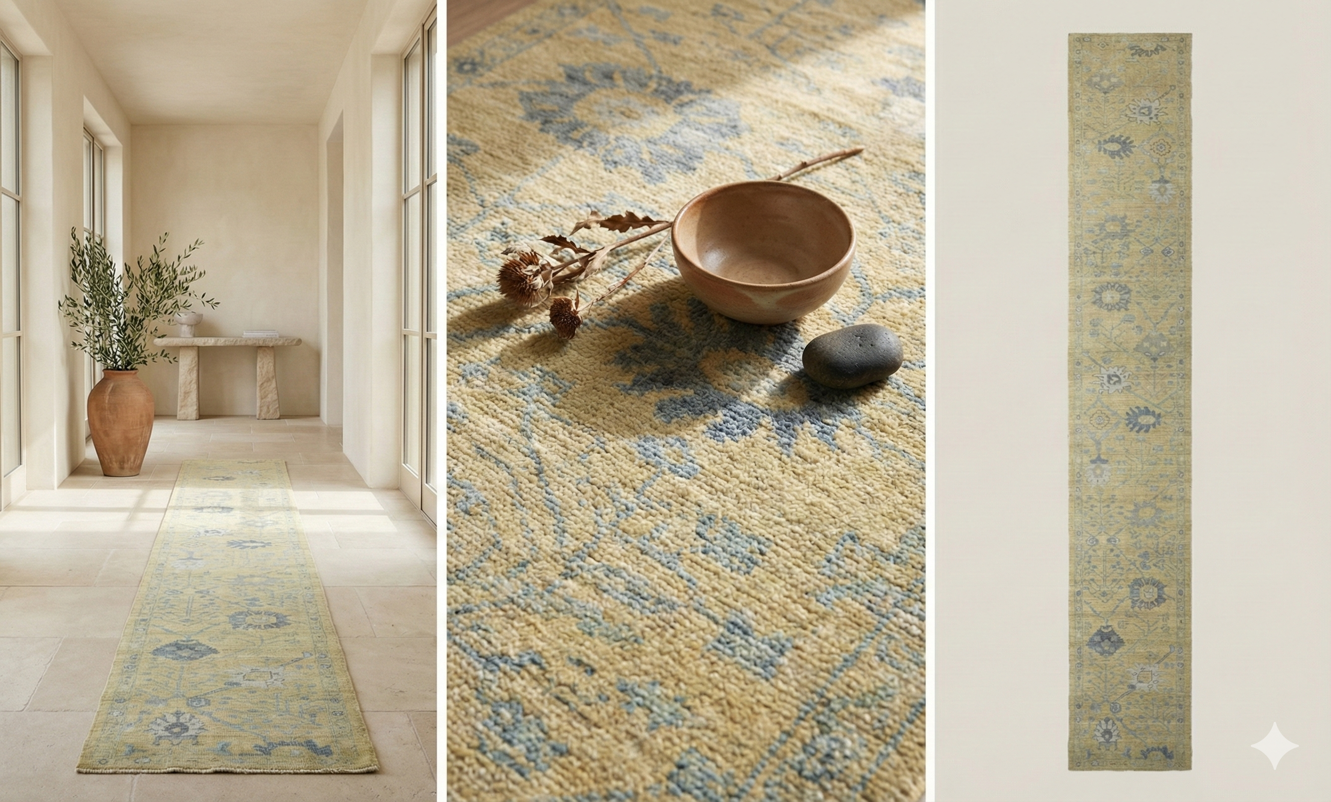 Light and airy with an earthy, calming mood, this geometric floral Oushak gallery runner feels refined and premium with a softly patterned allover design.