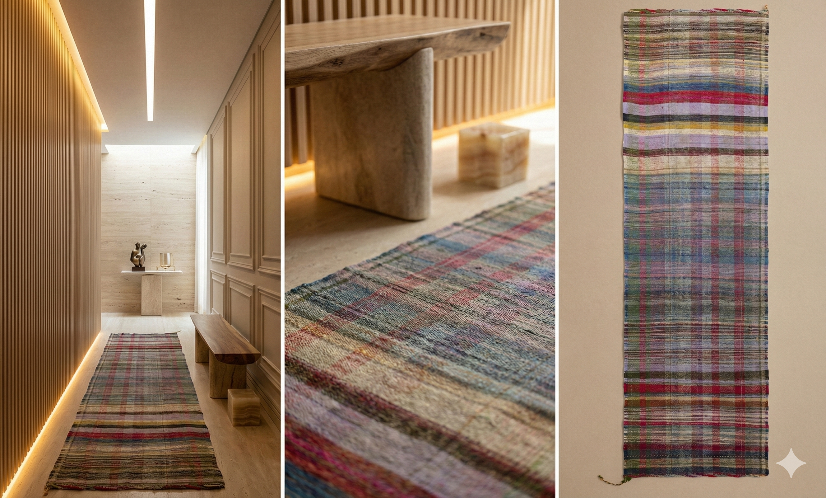 Motifs include linear stripes, plaid checks, color bands, woven texture, subtle bar motifs, and abstract fields. Its long, narrow runner format is ideal for hallways, entryways, corridors, galleries, kitchens, or casual living areas where a tribal, geometric statement is desired.