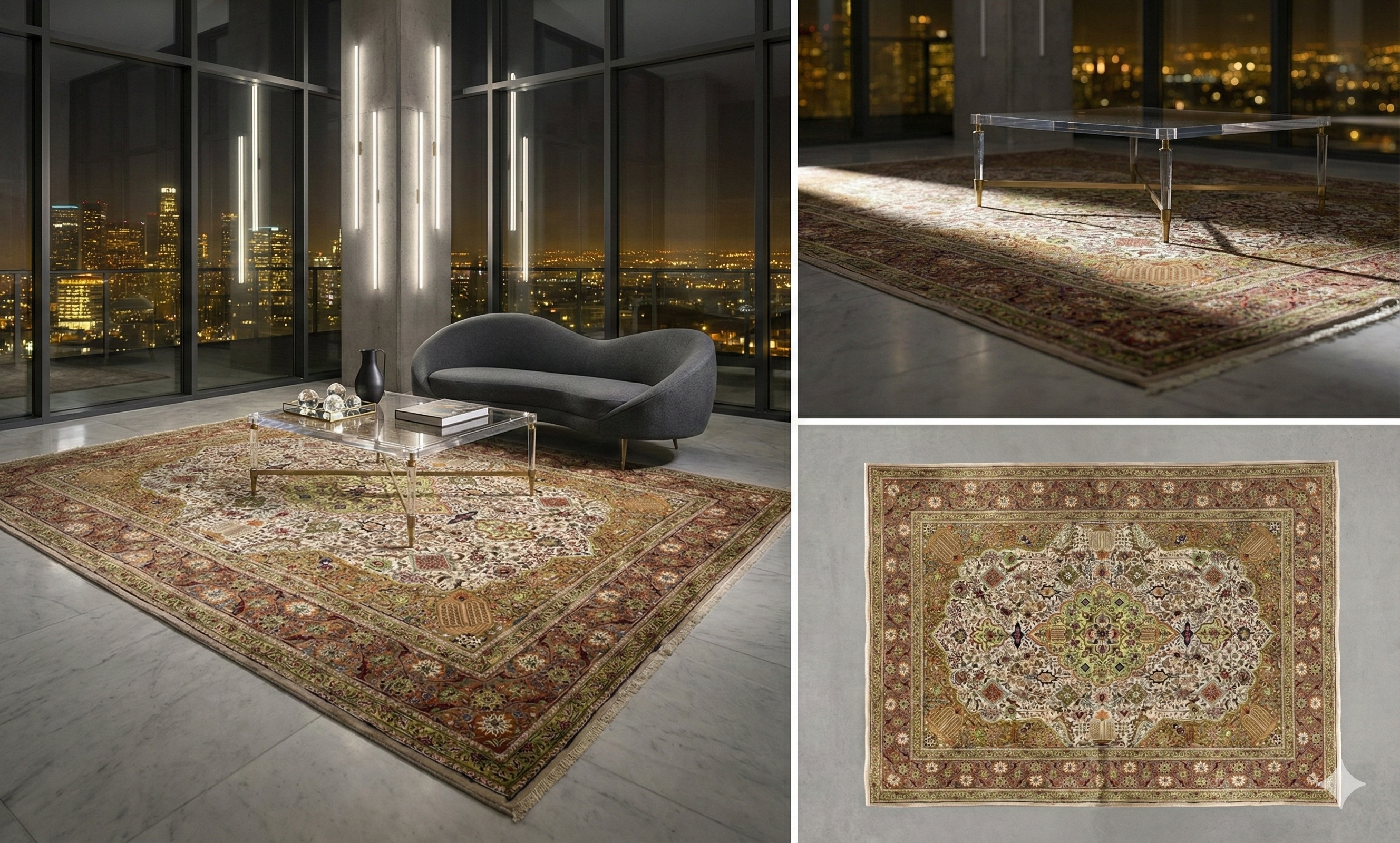 Motifs include a central medallion with cartouche forms, scrolling floral vines, palmette rosettes, lattice infill, corner spandrels, and layered framing borders. Ideal for anchoring living rooms, dining rooms, libraries, studies, formal sitting rooms, or large bedrooms that call for a warm, refined focal point. The balanced decorative field supports both formal and classic interiors.