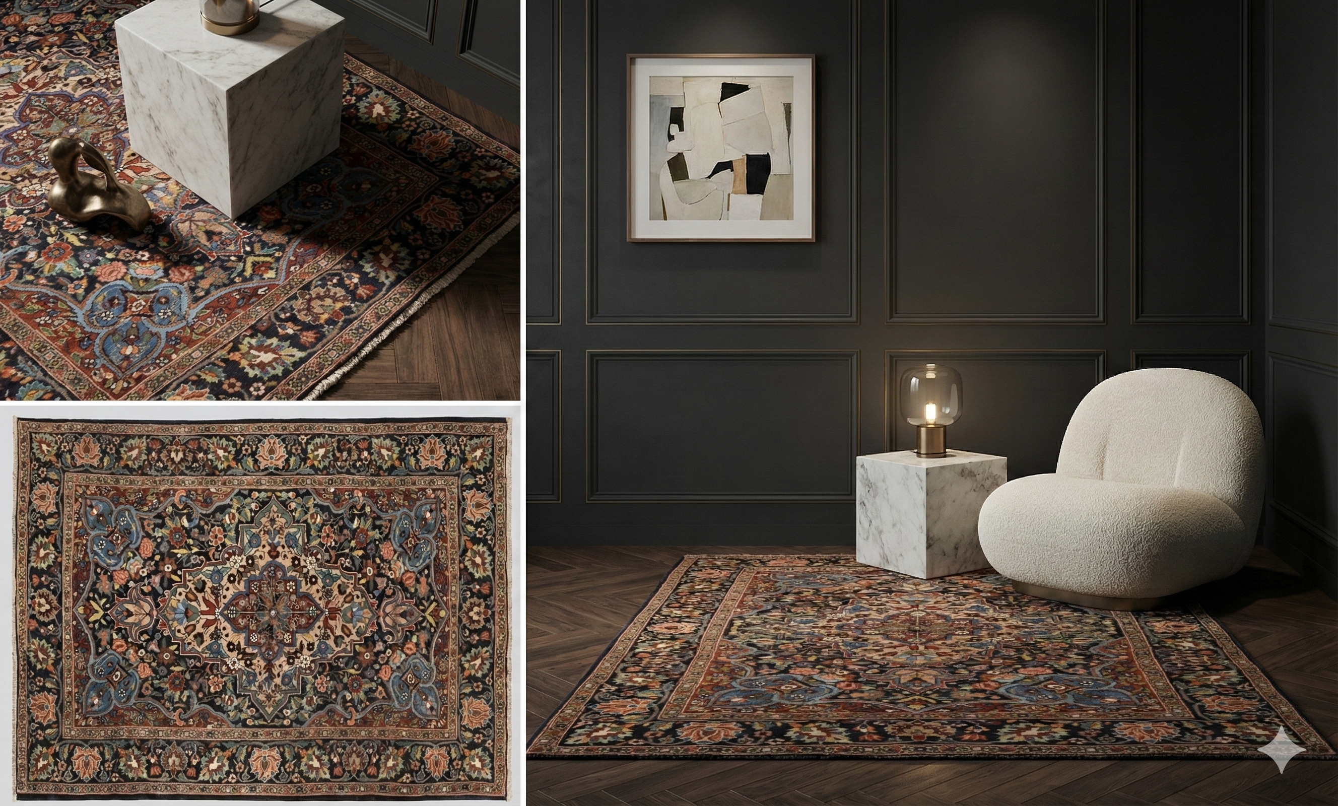 Dark, richly patterned Kermanshah small rug with a classic central medallion and dense floral geometry, giving an elegant, premium traditional feel.