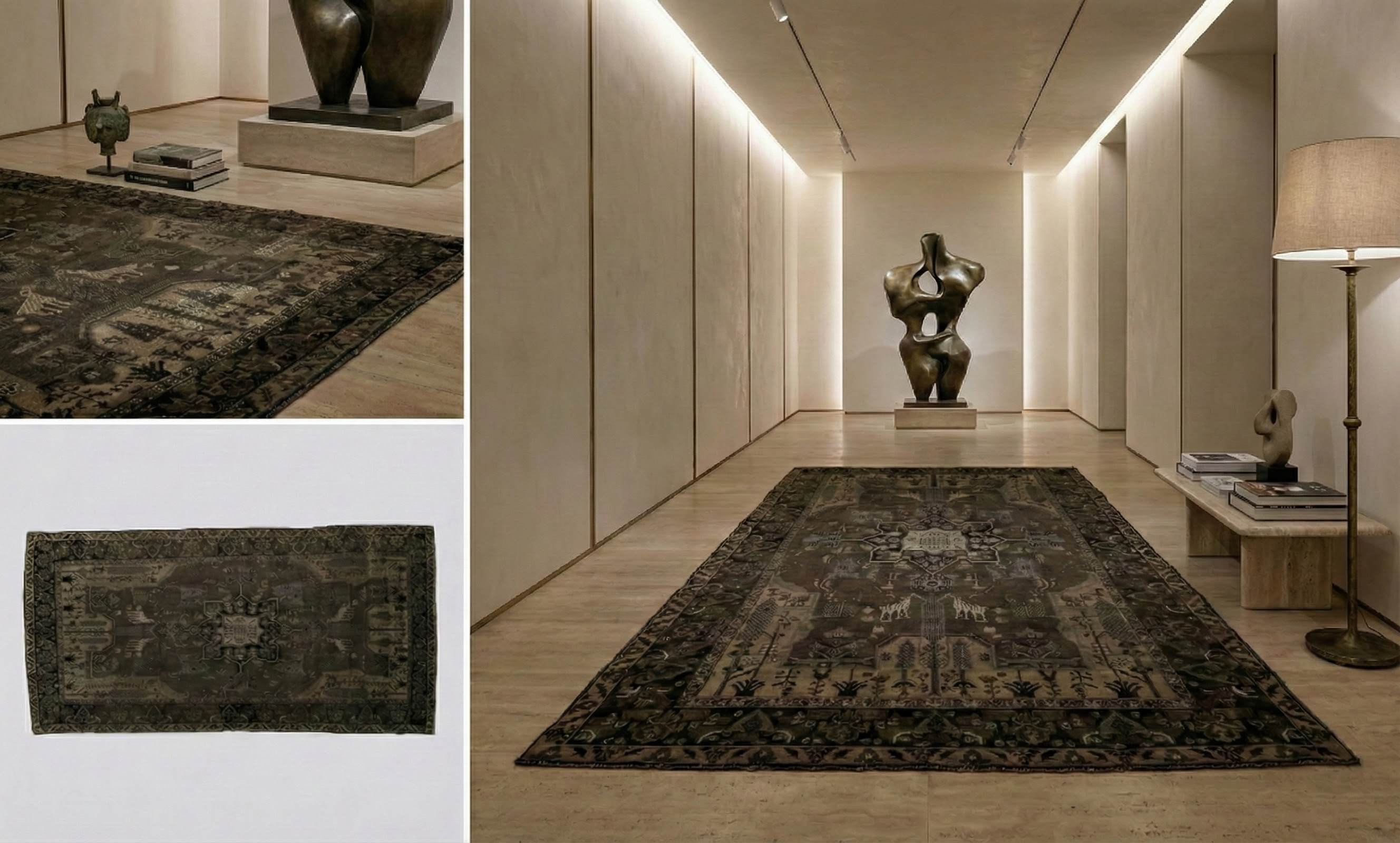 Motifs include a central geometric medallion, stylized animal figures, tree of life forms, architectural house elements, small floral blossoms, angular corner spandrels, and intricate border cartouches. Ideal for living rooms, libraries, studies, bedrooms, dining rooms, and entry halls where a narrative tribal character is desired.