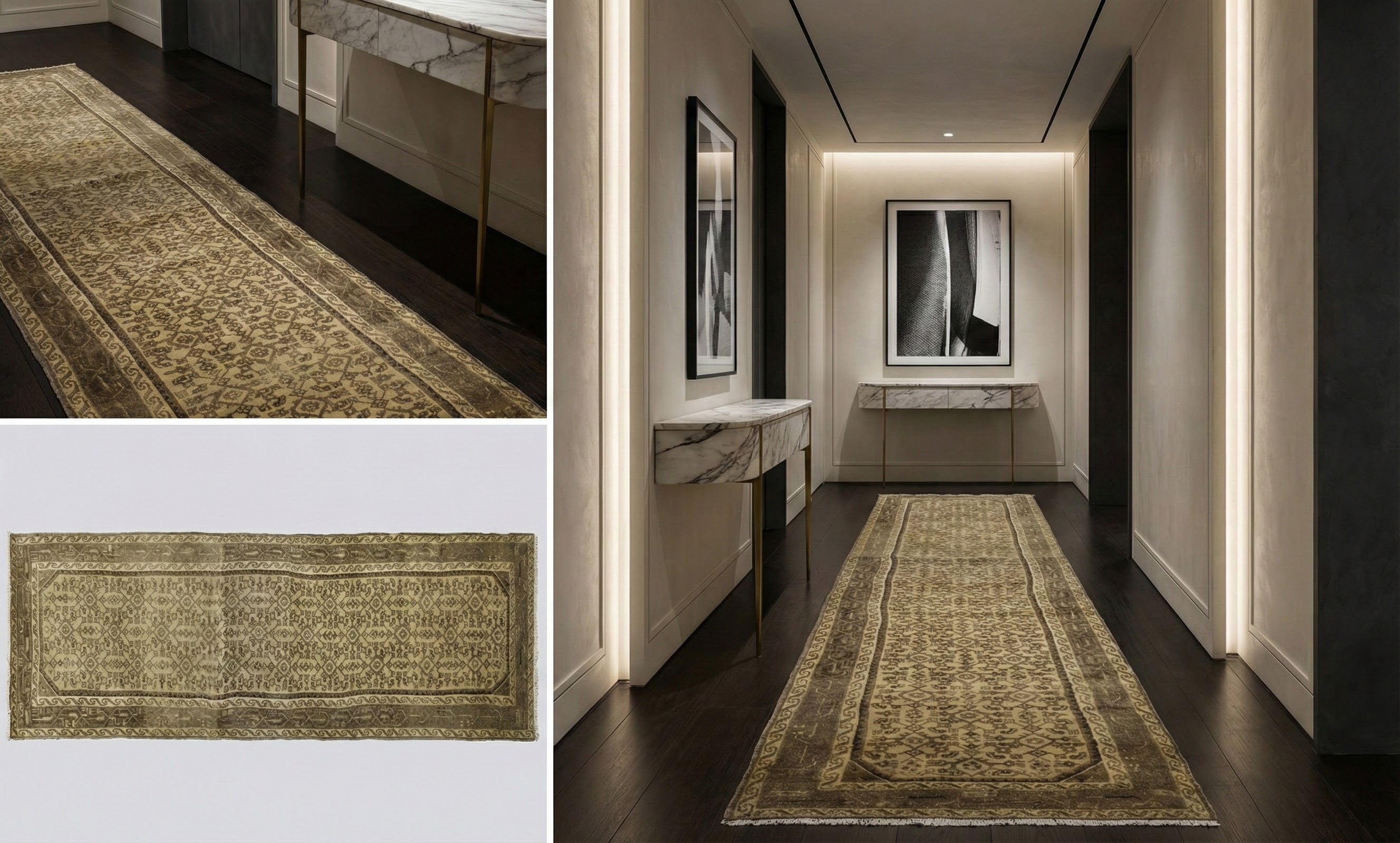 Motifs include small hooked diamonds, lattice cartouches, angular vine scrolls, tiny rosettes, border key patterns, and stepped corner panels that create a tightly patterned, geometric field. Ideal for hallways, entries, corridors, galleries, stair landings, long dressing areas, or kitchen runner zones where a tribal antique statement runner is desired.