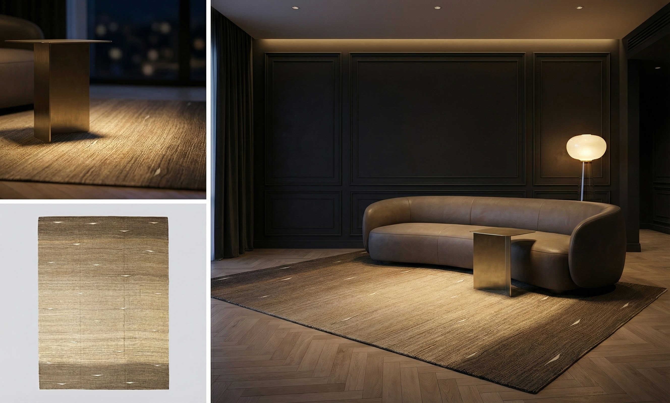 Design details include linear striations, soft ombre bands, subtle wave forms, elongated diamond flecks, and overall field texture patterning. The restrained pattern and earthy palette make it versatile for living rooms, dining rooms, bedrooms, home offices, libraries, or gallery spaces, and ideal where a calm, understated geometric statement is desired.