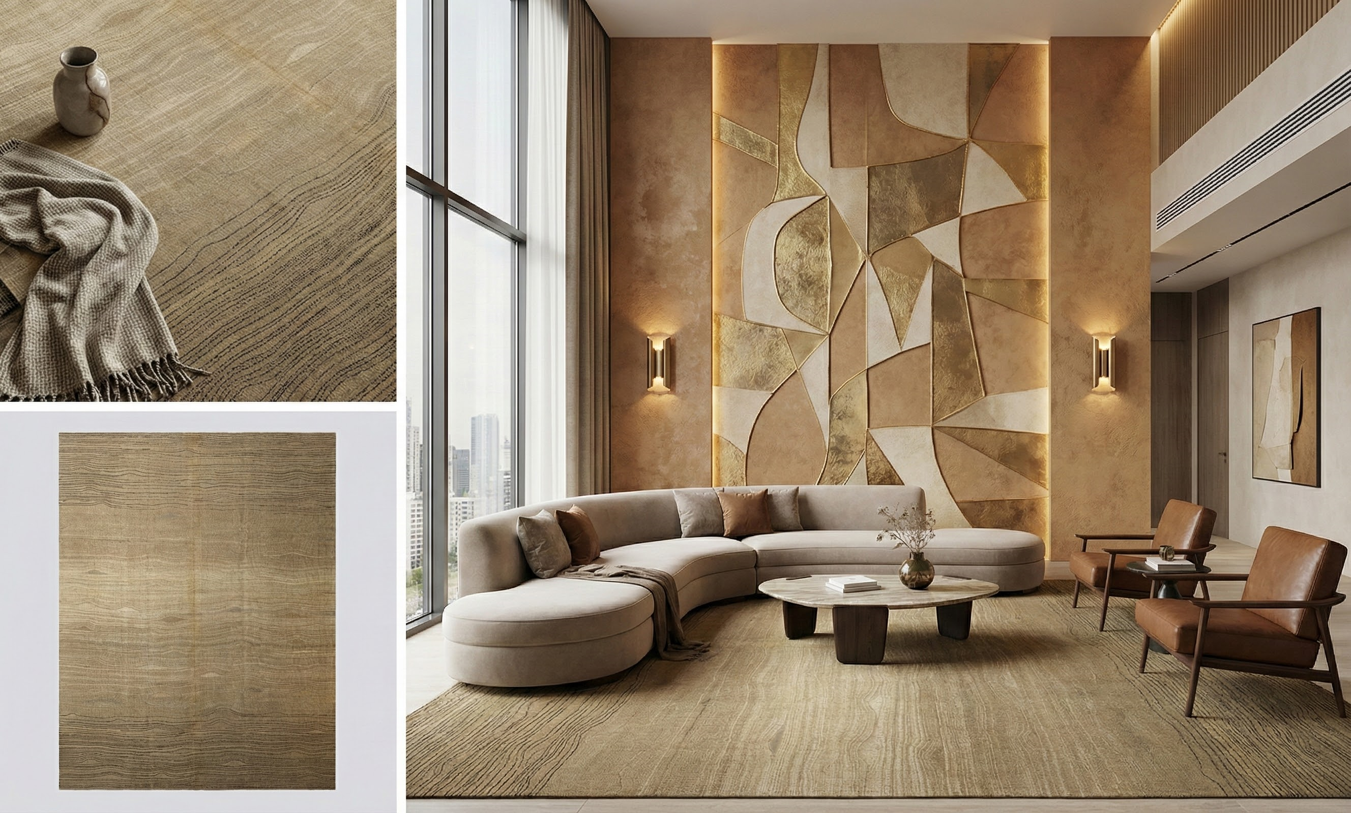 Motifs include horizontal wave lines, fine linear striations, subtle field banding, tonal horizon bands, and abstract landscape echoes. Works well in living rooms, dining rooms, bedrooms, studies, libraries, hallways, and offices where a modern geometric statement with understated patterning is desired.