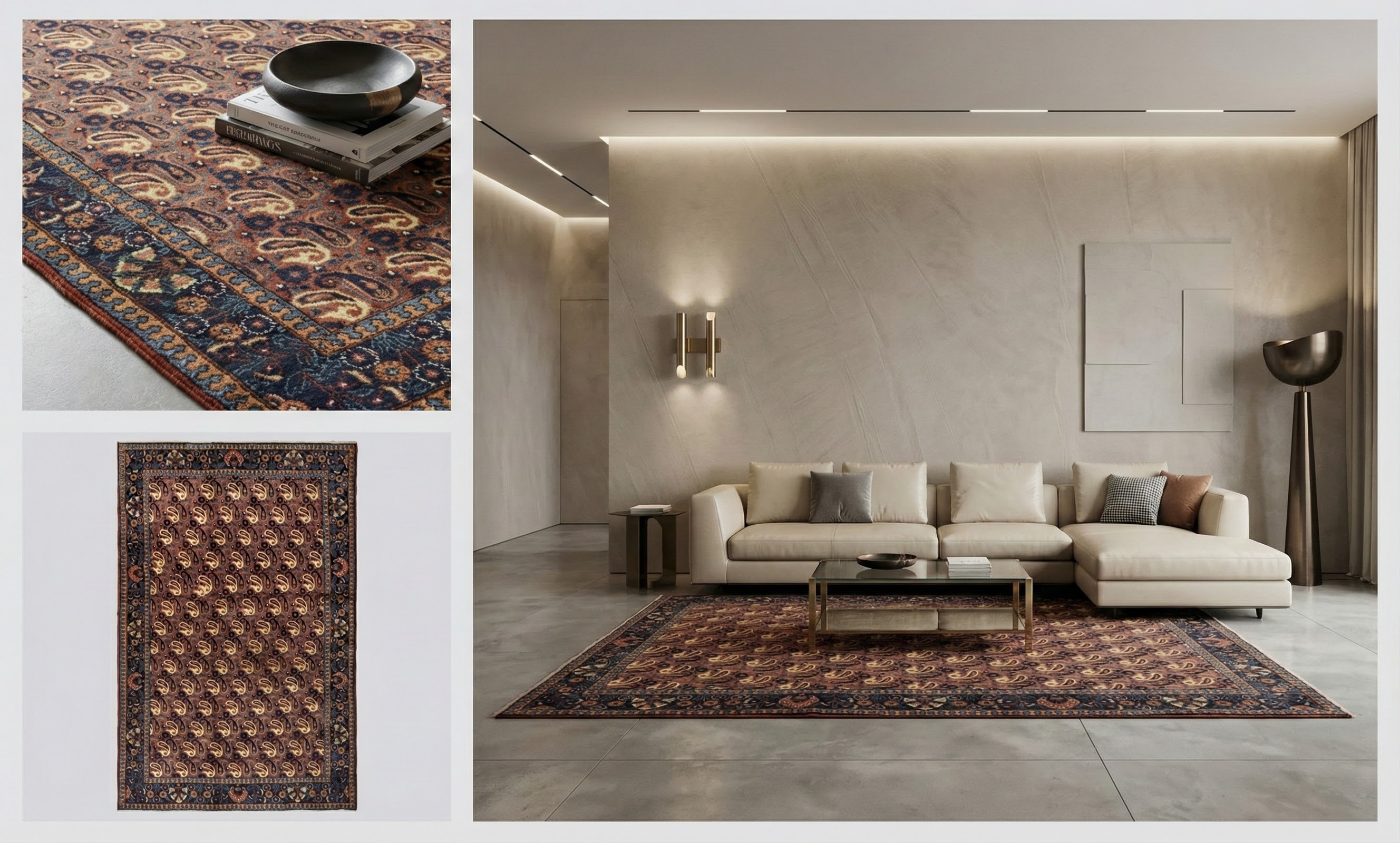 Dark, earthy and densely patterned, this antique Mashad small rug blends rich russet brown with deep navy in a tightly geometric allover layout that feels traditional yet bold, with an unmistakably premium impression.
