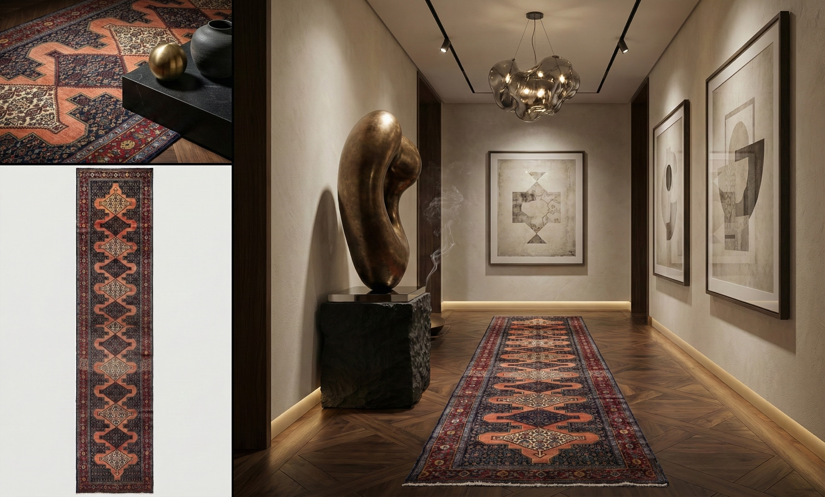Dark, earthy tribal runner with dense geometric and floral patterning, creating a balanced yet dramatic gallery presence in a premium tier piece.