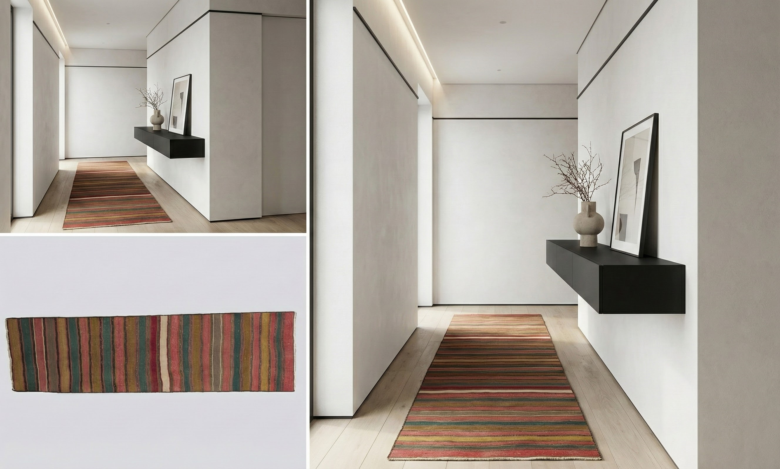 Features include color-block fields, subtle border lines, and an abstract geometric rhythm that adds visual movement without overwhelming a space. Well-suited for hallways, entries, kitchen runs, gallery corridors, dressing areas, and stair landings where a linear runner shape and defined striping enhance circulation paths.