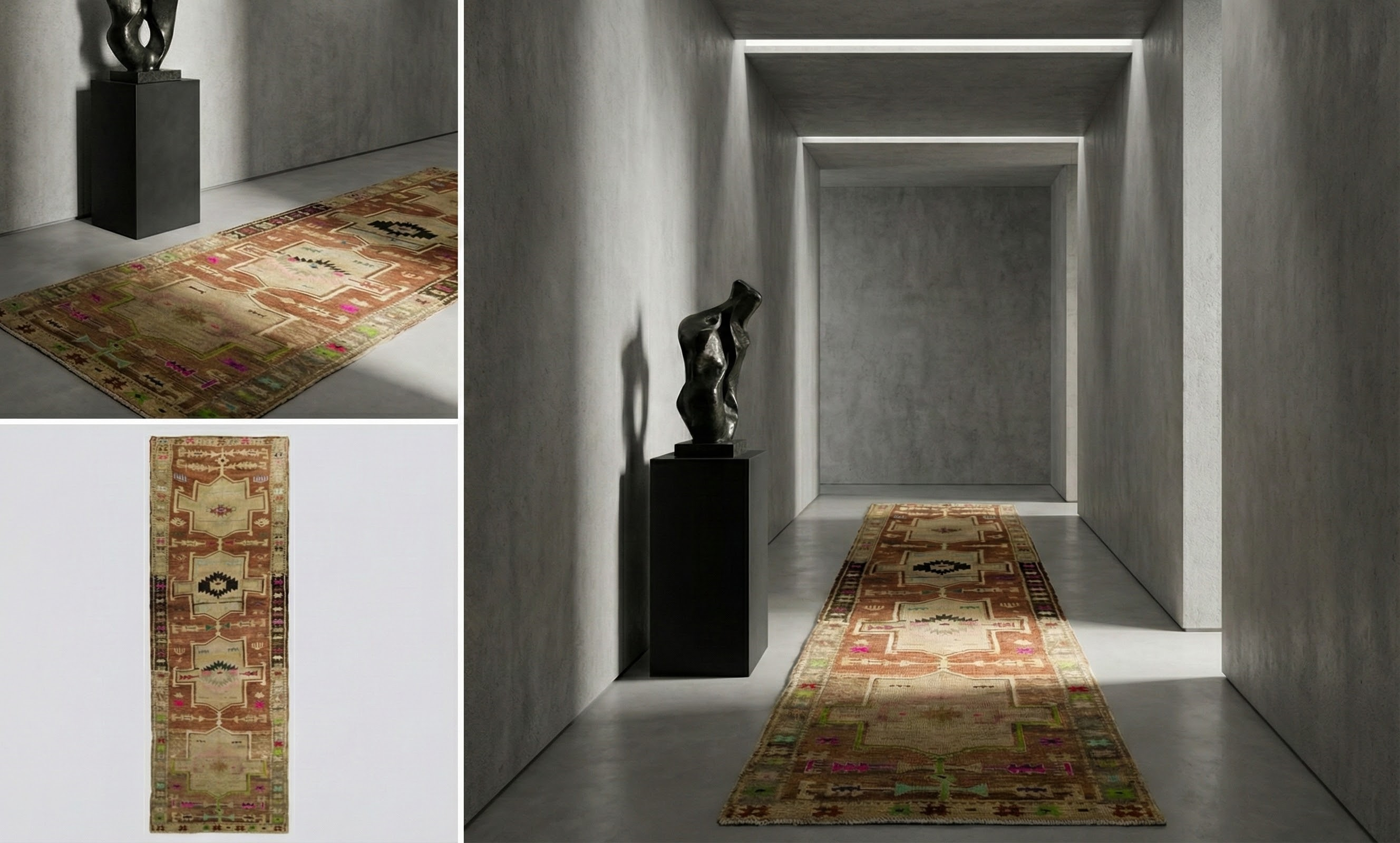 The design emphasizes stepped geometric medallions and hooked tribal motifs that create a rhythmic visual path along the corridor. Small cross flowers, border rosettes, and geometric animal traces add character and narrative depth. Well-suited for hallways, entryways, landings, kitchen runner zones, and gallery corridors where a strong tribal statement and earthy palette are desired.