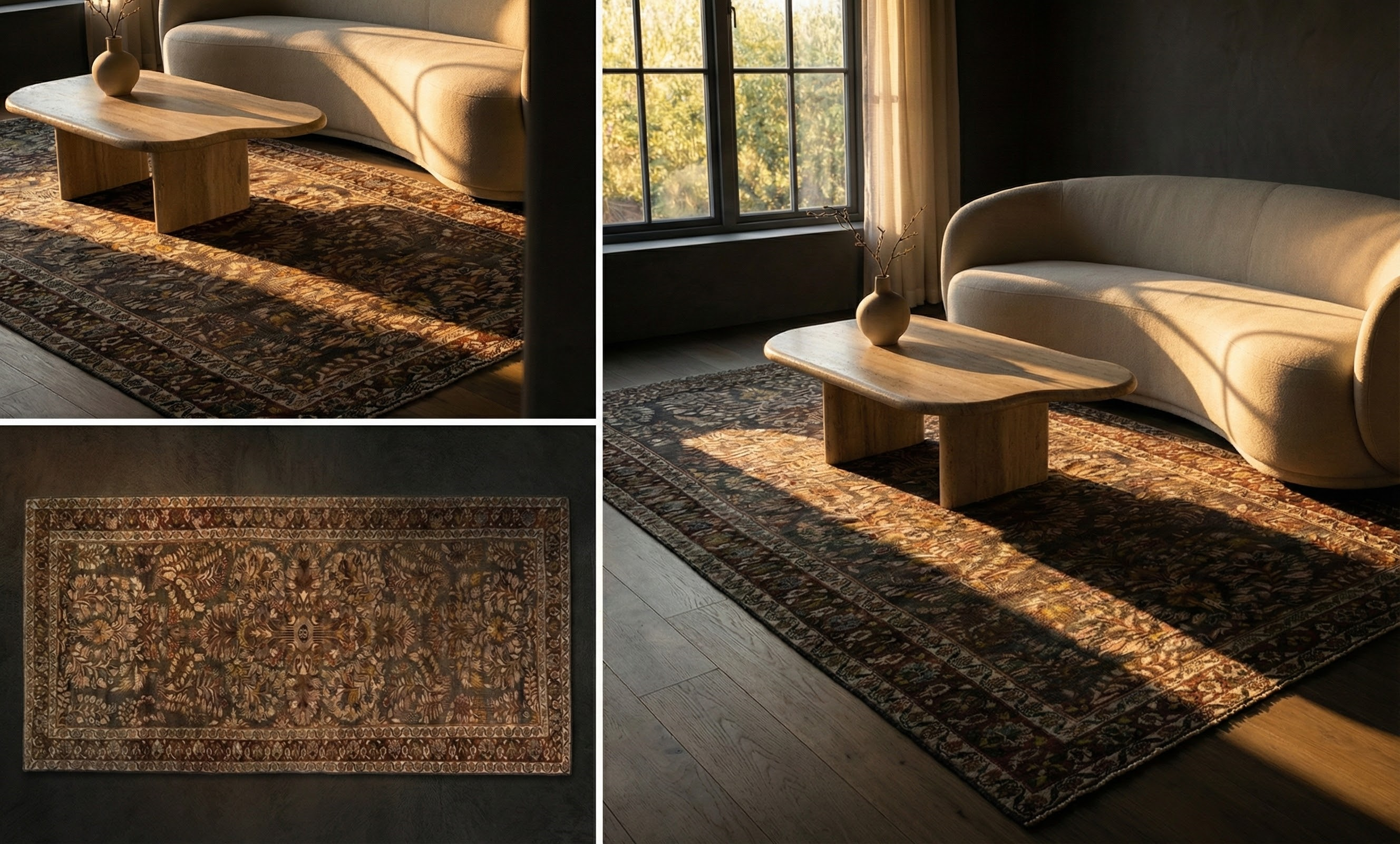 Dark, earthy Persian elegance with dense floral patterns and balanced geometry, giving a refined, premium traditional feel.
