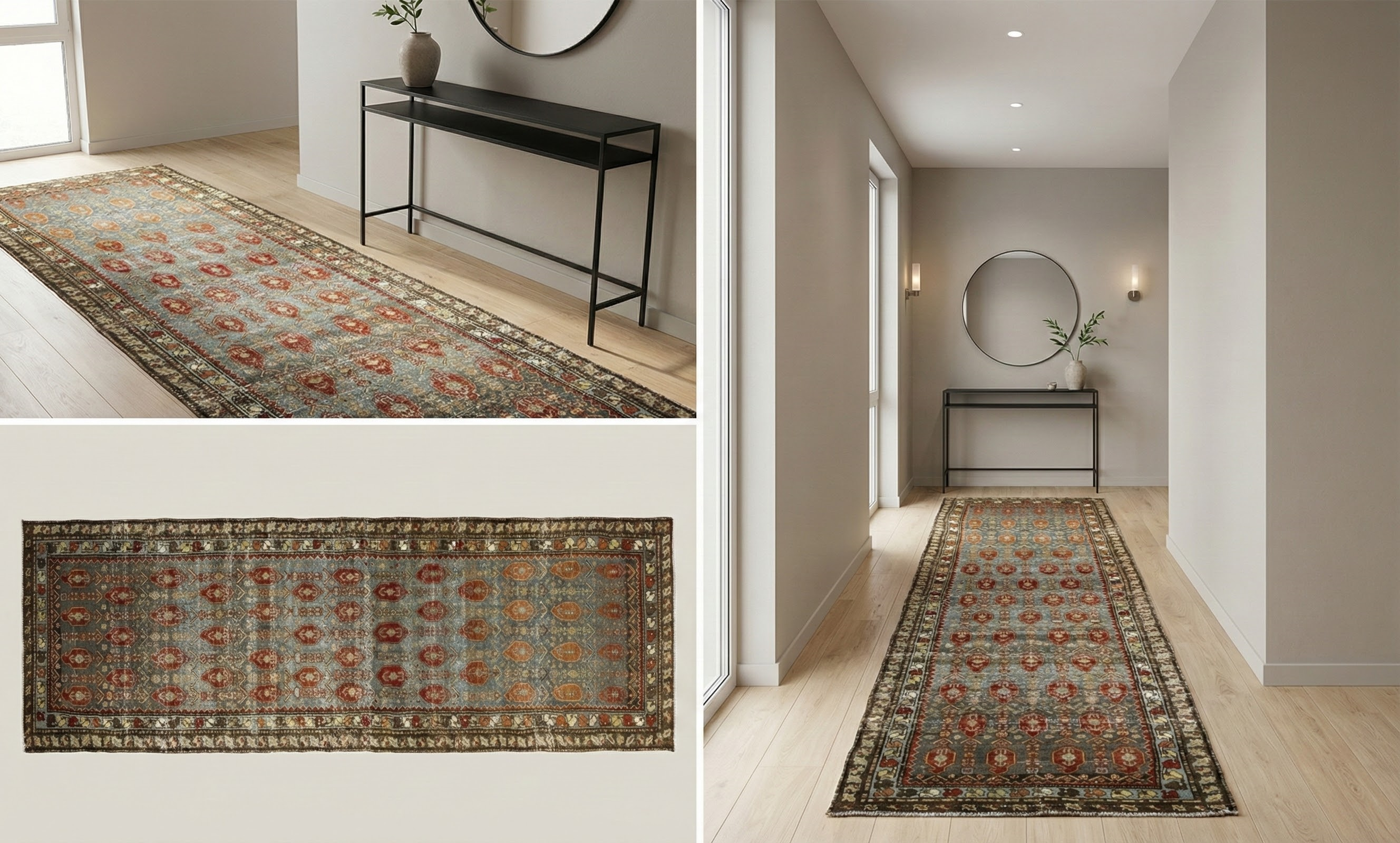 Medium-bright, earthy and warm corridor runner with dense geometric tribal patterning in dusty teal and brick red, giving a richly patterned, premium traditional look.